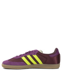 Adidas Originals "Samba OG W" Sneakers. Model features an upper made of high-quality satin and fabric with suede details. The construction maintains the traditional low silhouette inspired by indoor soccer shoes. The outsole is constructed of durable rubber for reliable traction on a variety of surfaces. The combination of glossy and textured materials defines the surface and gives balance between ruggedness and versatility. - Low-top silhouette with construction inspired by the original model - Structure that offers support and grip - Flat laces - Reinforced toe box - Lightly padded footbed - Adidas Originals logo visible on tongue - Textured detailing finish - Regular fit - Colour: Purple - Composition: 100% leather - 100% rubber - Country Of Manufacture: Vietnam - MPN: JS1316MAROONRICMA