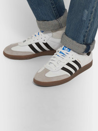 Little has changed when it comes to the streamlined low-top profile and gripped rubber soles of adidas Originals' 'Samba' sneakers – they were first released in the '50s for footballers training on icy ground. This latest pair is made from leather and reinforced at the toes with panels of suede. Shown here with Maison Margiela T-shirt, AMI overshirt, A.P.C. jeans. Size & Fit - UK 3.5 = US 4/ EU 36 - UK 4 = US 4.5/ EU 36.7 - UK 4.5 = US 5/ EU 37.3 - UK 5 = US 5.5/ EU 38 - UK 5.5 = US 6/ EU 38.7 - UK 6 = US 6.5/ EU 39.3 - UK 6.5 = US 7/ EU 40 - UK 7 = US 7.5/ EU 40.7 - UK 7.5 = US 8/ EU 41.3 - UK 8 = US 8.5/ EU 42 - UK 8.5 = US 9/ EU 42.7 - UK 9 = US 9.5/ EU 43.3 - UK 9.5 = US 10/ EU 44 - UK 10 = US 10.5/ EU 44.7 - UK 10.5 = US 11/ EU 45.3 - UK 11 = US 11.5/ EU 46 - UK 11.5 = US 12/ EU 46.7 - UK 12 = US 12.5/ EU 47.3 - UK 12.5 = US 13/ EU 48 - UK 13 = US 13.5/ EU 48.7 - UK 13.5 = US 14/ EU 49.3 - UK 14 = US 14.5/ EU 50 Details & Care - Off-white suede, white and black leather - Designer emblems, partial leather linings, rubber soles - Lace-up - Imported