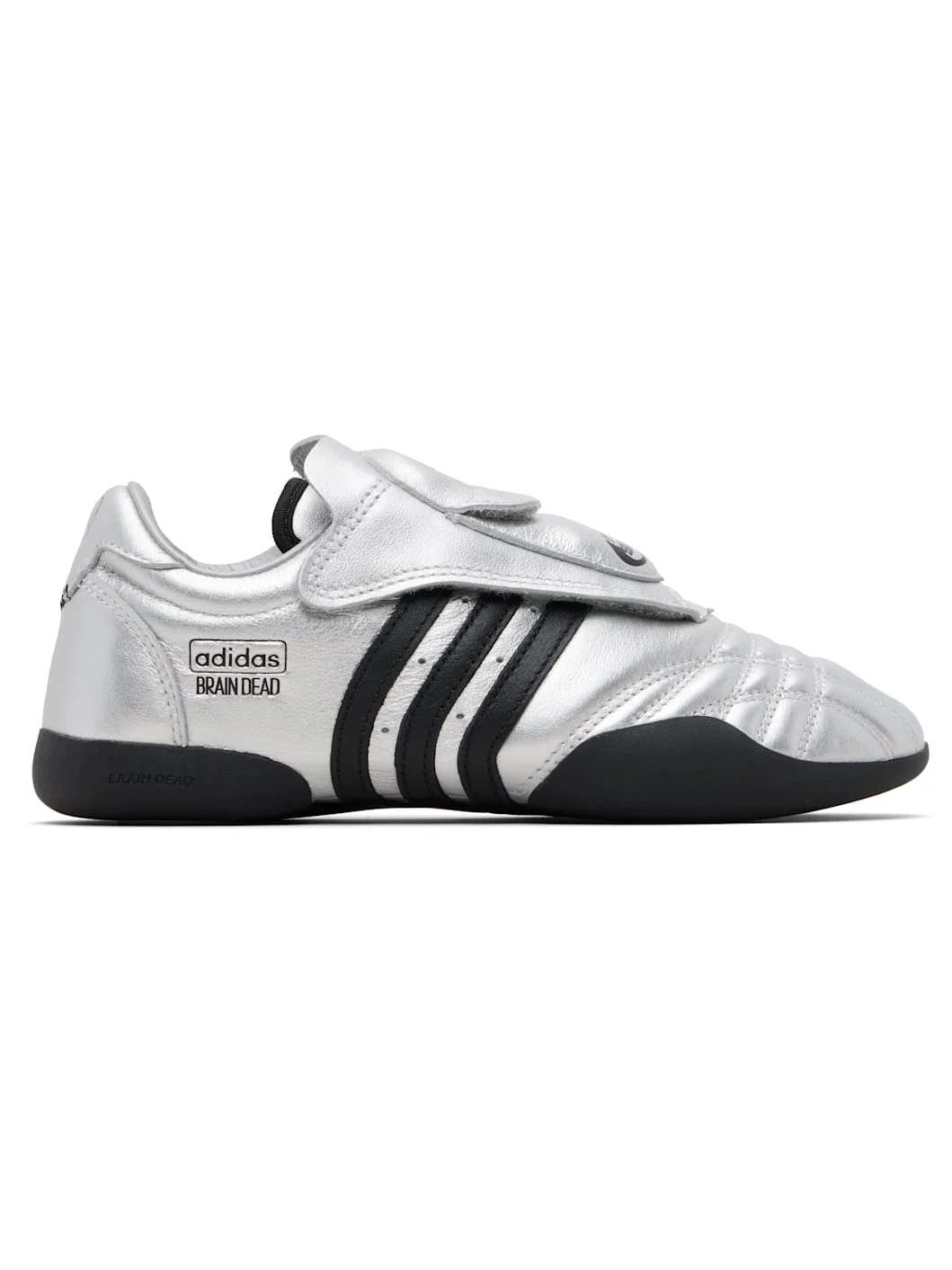 Low-top polished leather sneakers. · Quilted detailing at toe · Logo-embossed velcro panel at vamp · Flap pocket at single vamp · Cutout at single vamp · Concealed lace-up closure · Padded tongue and collar · Perforations at sides · Signature stripes and embossed logo at outer side · Embossed logo and topstitching at heel tab · Buffed leather lining · Treaded rubber sole Part of the adidas Originals x Brain Dead collaboration. Supplier color: Silver metallic/Core black Upper: leather. Sole: rubber. Made in Viet Nam 261751M237019