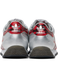 Low-top grained leather sneakers in silver tone. · Snake-embossed leather trim in red throughout · Lace-up closure · Logo patch at padded tongue · Padded collar · Signature serrated stripes at sides · Logo printed at outer side and heel tab · Buffed faux-leather and mesh lining · Foam rubber midsole · Treaded rubber sole Supplier color: Silver metallic/Better scarlet/Core black Upper: leather. Sole: rubber. Made in Viet Nam 251751M237086