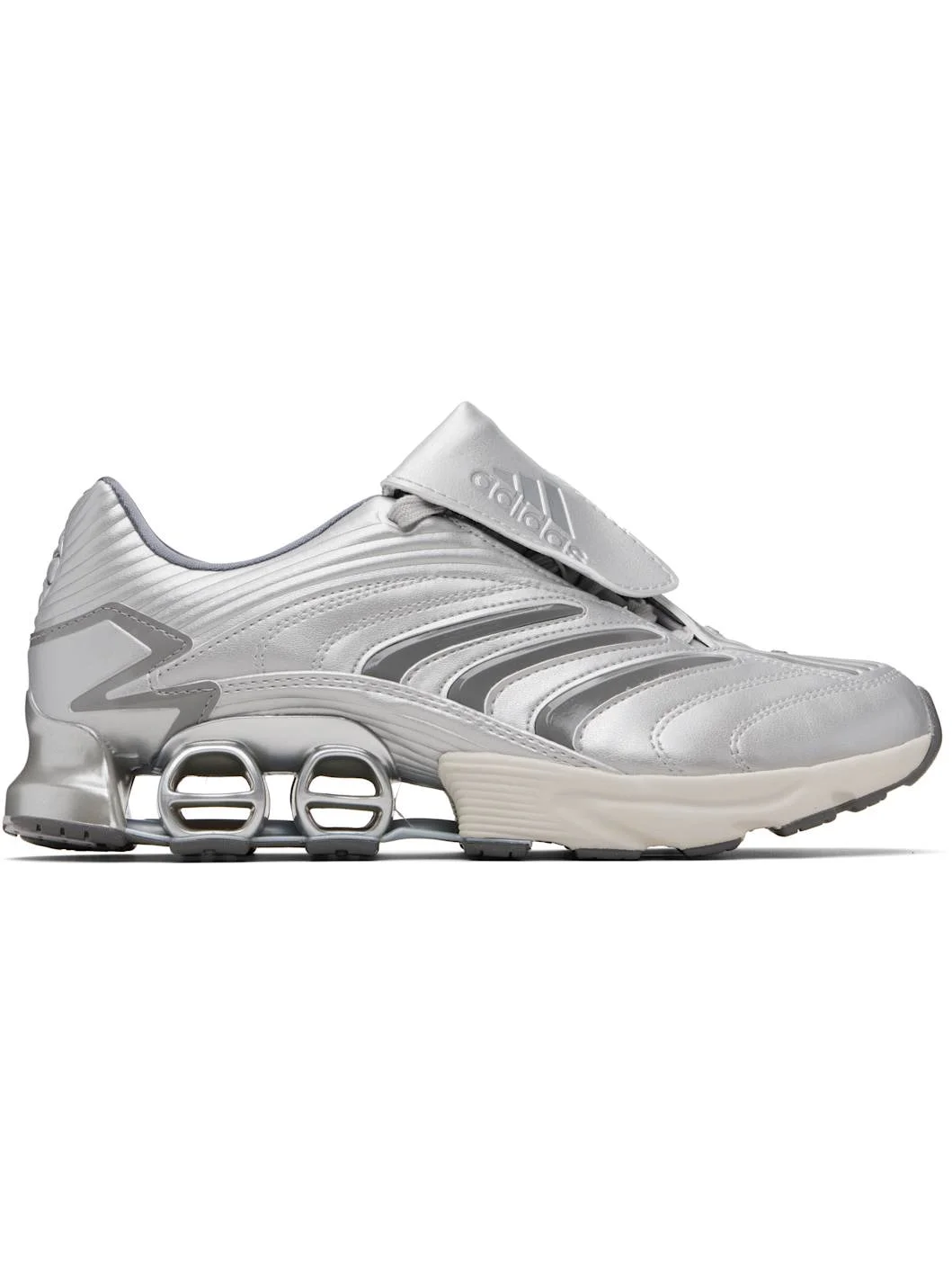 Low-top buffed faux-leather sneakers. · Stripes throughout · Logo embossed at toe · Offset lace-up closure · Rubberized trim at vamp · Logo embossed at extended foldover tongue · Quilted padded collar · Graphic embossed at heel tab · Mesh lining · Treaded rubber sole Supplier color: Grey two/Grey four/Silver metallic Upper: synthetic. Sole: rubber. Made in Viet Nam 252751M237213