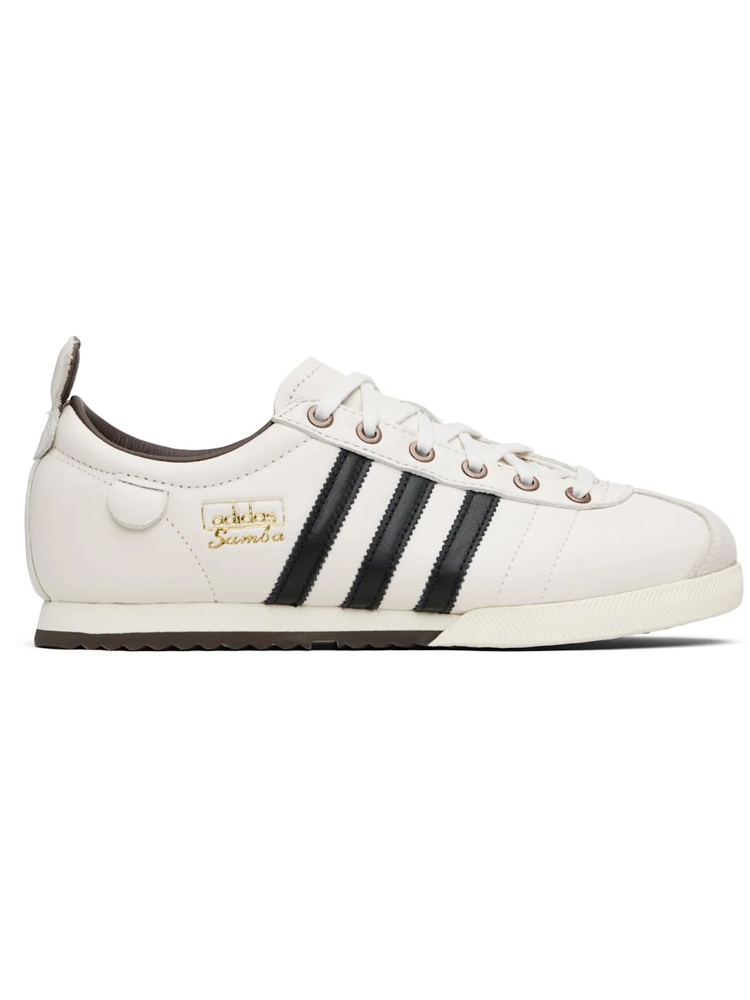 Low-top buffed leather sneakers. · Suede trim at toe · Lace-up closure · Padded tongue and collar · Padded pull-tab at heel collar · Signature serrated stripes at sides · Logo and text embossed at outer side · Buffed leather lining · Treaded rubber sole Supplier color: Cloud white/Core black/Brown Upper: leather. Sole: rubber. Made in Viet Nam 251751M237115