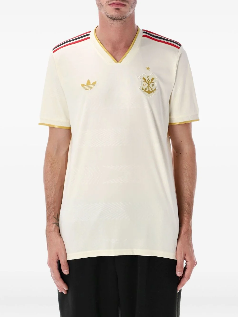 striped V-neck T-shirt Highlights - Cream - Striped shoulders - V-neck - Short sleeves - Logo detail - Emblem detail Imported Composition Fabric 100% Washing instructions Read Manufacturer Guidelines