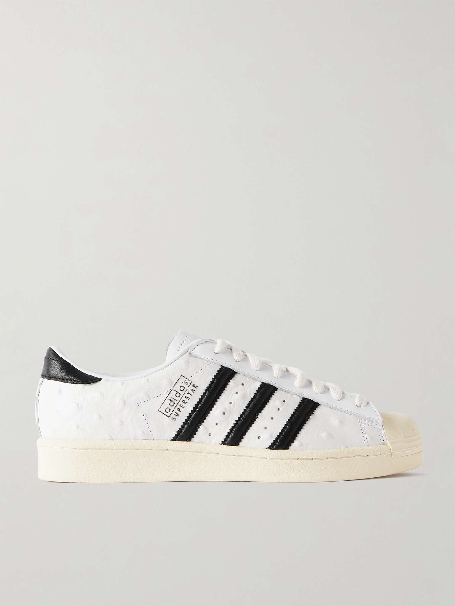 Sneaker culture wouldn't be the same without adidas Originals' 'Superstar' low-tops - a favourite of designers, athletes and musicians since the '80s. Featuring the same rubber 'shell' toes, this 'Vintage' version is made from ostrich-effect leather and has the signature '3-Stripes' along the sides. Size & Fit - UK 3.5 = Men’s US 4 (Women’s US 5)/ EU 36 - UK 4 = Men’s US 4.5 (Women’s US 5.5)/ EU 36.7 - UK 4.5 = Men’s US 5 (Women’s US 6)/ EU 37.3 - UK 5 = Men’s US 5.5 (Women’s US 6.5)/ EU 38 - UK 5.5 = Men’s US 6 (Women’s US 7)/ EU 38.7 - UK 6 = Men’s US 6.5 (Women’s US 7.5)/ EU 39.3 - UK 6.5 = Men’s US 7 (Women’s US 8)/ EU 40 - UK 7 = Men’s US 7.5 (Women’s US 8.5)/ EU 40.7 - UK 7.5 = Men’s US 8 (Women’s US 9)/ EU 41.3 - UK 8 = Men’s US 8.5 (Women’s US 9.5)/ EU 42 - UK 8.5 = Men’s US 9 (Women’s US 10)/ EU 42.7 - UK 9 = Men’s US 9.5 (Women’s US 10.5)/ EU 43.3 - UK 9.5 = Men’s US 10 (Women’s US 11)/ EU 44 - UK 10 = Men’s US 10.5 (Women’s US 11.5)/ EU 44.7 - UK 10.5 = Men’s US 11 (Women’s US 12)/ EU 45.3 - UK 11 = Men’s US 11.5 (Women’s US 12.5)/ EU 46 - UK 11.5 = Men’s US 12 (Women’s US 13)/ EU 46.7 - UK 12 = Men’s US 12.5 (Women’s US 13.5)/ EU 47.3 - UK 12.5 = Men’s US 13 (Women’s US 14)/ EU 48 - UK 13 = Men’s US 13.5 (Women’s US 14.5)/ EU 48.7 - UK 13.5 = Men’s US 14 (Women’s US 15 )/ EU 49. - UK 14 = Men’s US 14.5 (Women’s US 15.5)/ EU 50 - Packaging reflects women’s sizing Details & Care - White Ostrich-effect leather, black leather - Lace-up - Style number: JH5709 - adidas Originals follows its own size guide, therefore the size stated on the box will differ from the one provided in our size chart. To receive your correct fit, please refer to Size & Fit notes