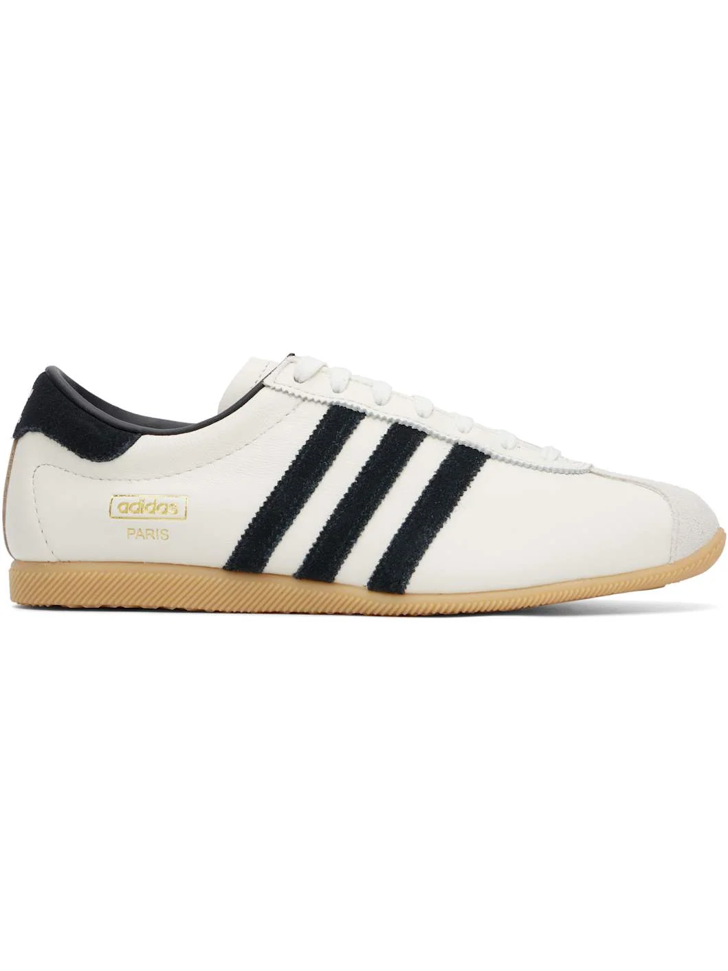 Low-top buffed leather sneakers. · Suede trim at toe and heel tab · Lace-up closure · Padded collar · Signature serrated stripes at sides · Logo stamp at outer side · Logo printed at heel tab · Suede lining · Treaded rubber sole Supplier color: Core White/Core Black/Gum Upper: leather. Sole: rubber. Made in Viet Nam 261751M237089