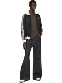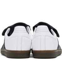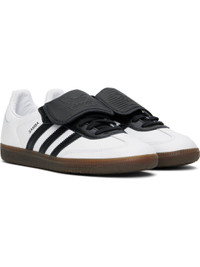 Low-top buffed leather sneakers in white and black. · Lace-up closure · Logo-embossed at extended foldover tongue · Padded collar · Text printed at outer side · Signature serrated stripes at sides · Buffed leather lining · Treaded rubber sole Supplier color: Cloud white/Core black/gum Upper: leather. Sole: rubber. Made in Viet Nam 251751M237107