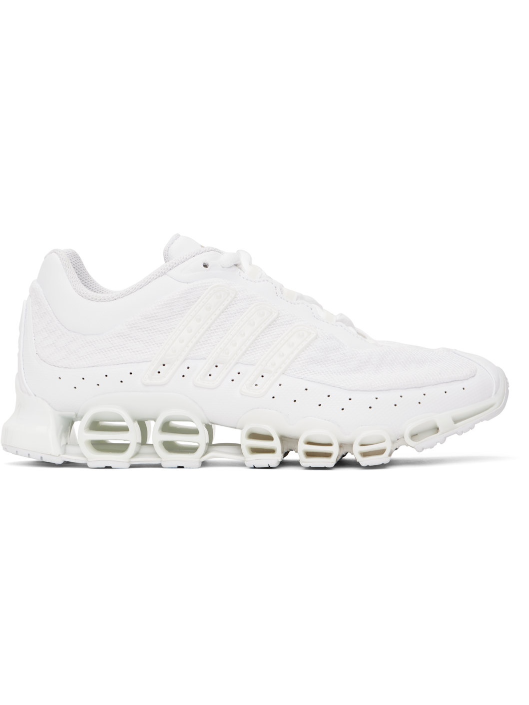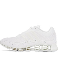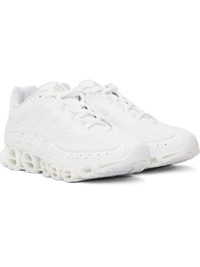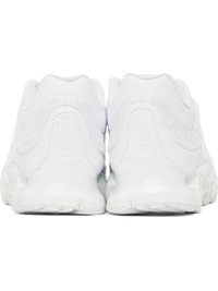 Low-top mesh sneakers in white. · Faux-leather mudguard overlays throughout · Lace-up closure · Padded neoprene tongue and collar · Logo embossed at tongue and heel counter · Signature stripes and perforations at sides · Mesh lining · Cutouts at cushioned midsole · Treaded rubber sole Supplier color: Cloud white/Cloud white/Grey one