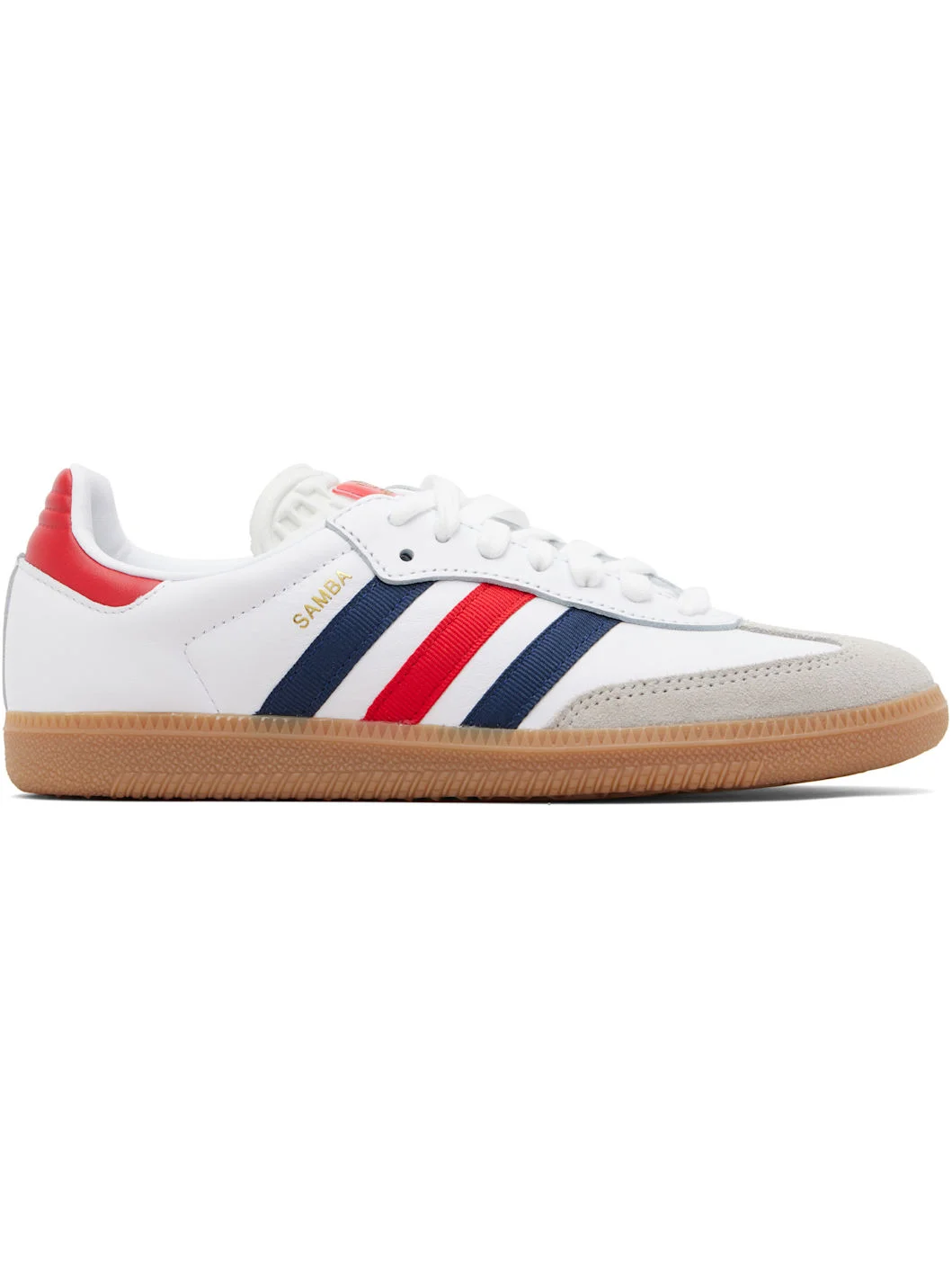 Low-top grained leather and suede sneakers. · Lace-up closure · Logo patch at tongue · Padded collar · Signature stripes at sides · Logo stamp at outer side · Quilted heel tab · Mesh lining · Treaded rubber sole Supplier color: Cloud white/Night indigo/Better scarlet Upper: leather. Sole: rubber. Made in Viet Nam 261751M237146