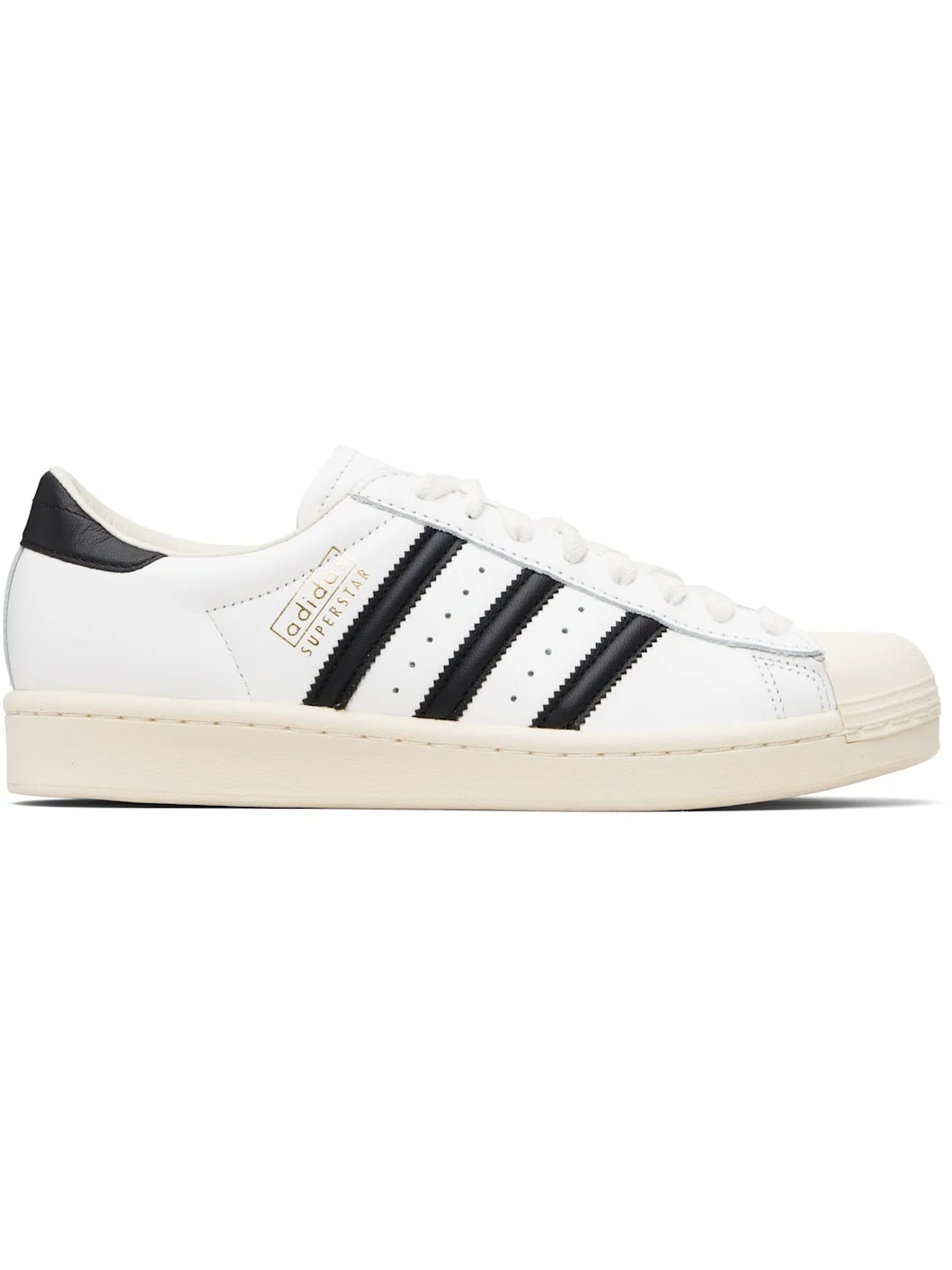 Low-top grained leather sneakers. · Textured rubber cap toe · Lace-up closure · Padded collar · Signature stripes and perforations at sides · Logo stamp at outer side · Grained leather lining · Treaded rubber sole Supplier color: Core white/Core black/Cream white Upper: leather. Sole: rubber. Made in Indonesia 261751M237220
