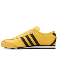 Low-top buffed leather sneakers. · Suede trim at toe · Lace-up closure · Logo stamp at tongue and outer side · Padded collar · Signature serrated stripes at sides and heel · Mesh lining · Treaded rubber sole Supplier color: Spring yellow/Dark brown/Core black Upper: leather. Sole: rubber. Made in Viet Nam 261751M237077