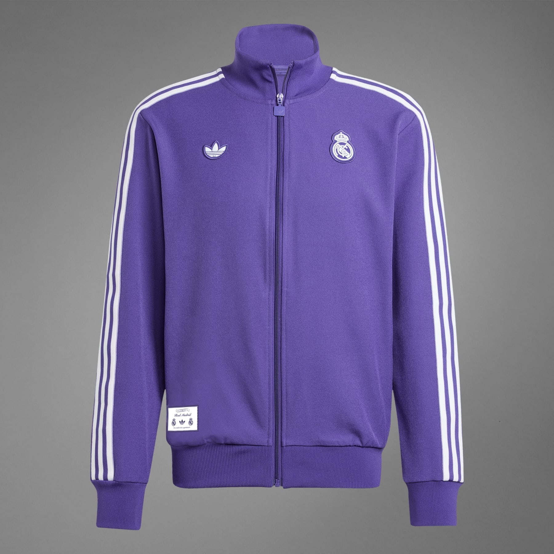 A slim-fitting track top for Real Madrid fans, made in part with recycled materials. Born from a soccer fashion revolution. This Real Madrid track top pays tribute to the '80s terrace culture that took Europe by storm. From its heritage adidas silhouette to that woven label, it makes a real statement. The streamlined fit stays out of your way when you're weaving through match day crowds. A sewn-on club crest ensures everyone knows who you back. This product is made with at least 70% recycled materials. By reusing materials that have already been created, we help to reduce waste and our reliance on finite resources and reduce the footprint of the products we make. Details - Slim fit - Full zip with ribbed stand-up collar - 94% polyester (recycled), 6% elastane - Front zip pockets - Ribbed cuffs and hem - Real Madrid sewn-on crest - Imported - Product code: JF2582 - Product color: Purple