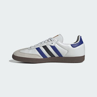 Score one for heritage style in these iconic low top shoes. Paying homage to the Samba's soccer roots, the adidas Samba OG taps into color schemes from classic '90s cleats. The leather and synthetic upper follows the shoe's iconic form, recreating the classic clean stitching and crisp details. The rubber outsole provides traction around town, while the distinct T-toe provides reinforcement. Whether dressed up with jeans and a blazer or paired with a hoodie and shorts, these Sambas are a match. Details - Regular fit - Lace closure - Leather and synthetic upper - Textile and synthetic lining - Rubber outsole - Imported - Product code: ID1381 - Product color: Crystal White / Active Blue / Matte Gold