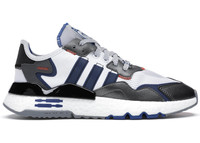 With its metallic sheen, robotic hints, and familiar colorway, the adidas Nite Jogger Star Wars R2D2 represents a collaboration between a classic sports shoe and the renowned droid character from the Star Wars franchise. The upper of the Star Wars R2D2 adidas Nite Jogger is white mesh, overlaid with metallic-looking black leather and accents of blue leather. The signature adidas 3-Stripes grace the side panel in blue as black synthetic material wraps around the heel for stability. Hits of orange stitching adorn the upper on the collar and eye stays, and the blue insole features adidas branding. The white midsole with blue robotic graphics is made of adidas Boost, and the rubber outsole in gray, blue, and orange features debossed adidas branding on the heel. What we love most about this sneaker is the picture of R2-D2, along with Star Wars and adidas branding on the tongue tag and the Star Wars lace jewel. The adidas Nite Jogger Star Wars R2D2 was released on December 2nd, 2019, for a retail price of $130. - Style FV8040 - Colorway Cloud White/Cloud White/Core Black - Retail Price 130 - Release Date 2019-12-02 - Included Accessories Adidas Star War Flip Top Box - Featured false