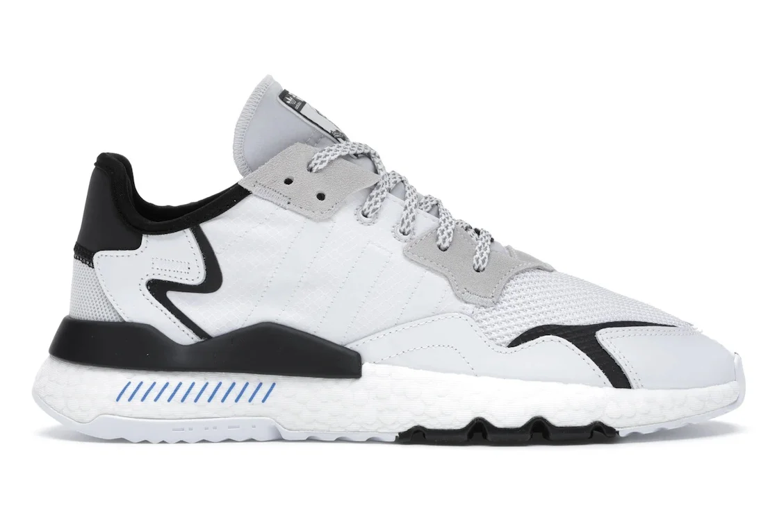 The adidas Nite Jogger Star Wars Storm Trooper is a limited edition sneaker that combines the iconic design of the Storm Trooper with the modern style of the Nite Jogger. The upper is made of white mesh and leather, with black accents and Storm Trooper graphics on the heel and tongue. The Boost midsole provides cushioning and energy return, while the rubber outsole offers traction and durability. The reflective details on the upper and laces add visibility in low-light conditions. The release date was December 17, 2019, and the retail price was $130. This sneaker is a must-have for Star Wars fans and sneakerheads alike, with its unique design and comfortable construction. - Style FW2287 - Colorway Cloud White/Cloud White/Core Black - Retail Price 130 - Release Date 2019-12-17 - Featured false