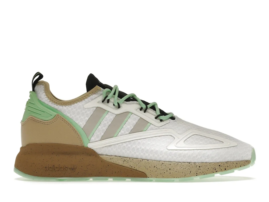 The adidas ZX 2K Boost Star Wars The Mandalorian Mudhorn is a special shoe from the ZX series by adidas which combines retro aesthetics with modern technology. The colorway takes inspiration from the Star Wars franchise, particularly the Child and Mandalorian's battle. The shoe has a predominantly white upper made from mesh material with leather overlays. The white color scheme is complemented by a black tongue, brown heel cap and striking accents of mint green. The sole, on the other hand, features a half-and-half design with light and dark shades of brown complemented by a speckled pattern. Branding elements on the adidas ZX 2K Boost include the iconic three stripes on the side panels, plus an adidas Trefoil logo on the heel tab. One thing our experts love about the adidas ZX 2K Boost Star Wars The Mandalorian Mudhorn is the lightweight and breathable upper, which keeps your feet cool and comfortable even during extended runs. The shoes were first released at the retail price of $150 on November 4, 2020. - Style GZ2760 - Colorway Cloud White/Glory Mint/Core Black - Retail Price 150 - Release Date 2020-11-04 - Featured false - Product Line adidas ZX