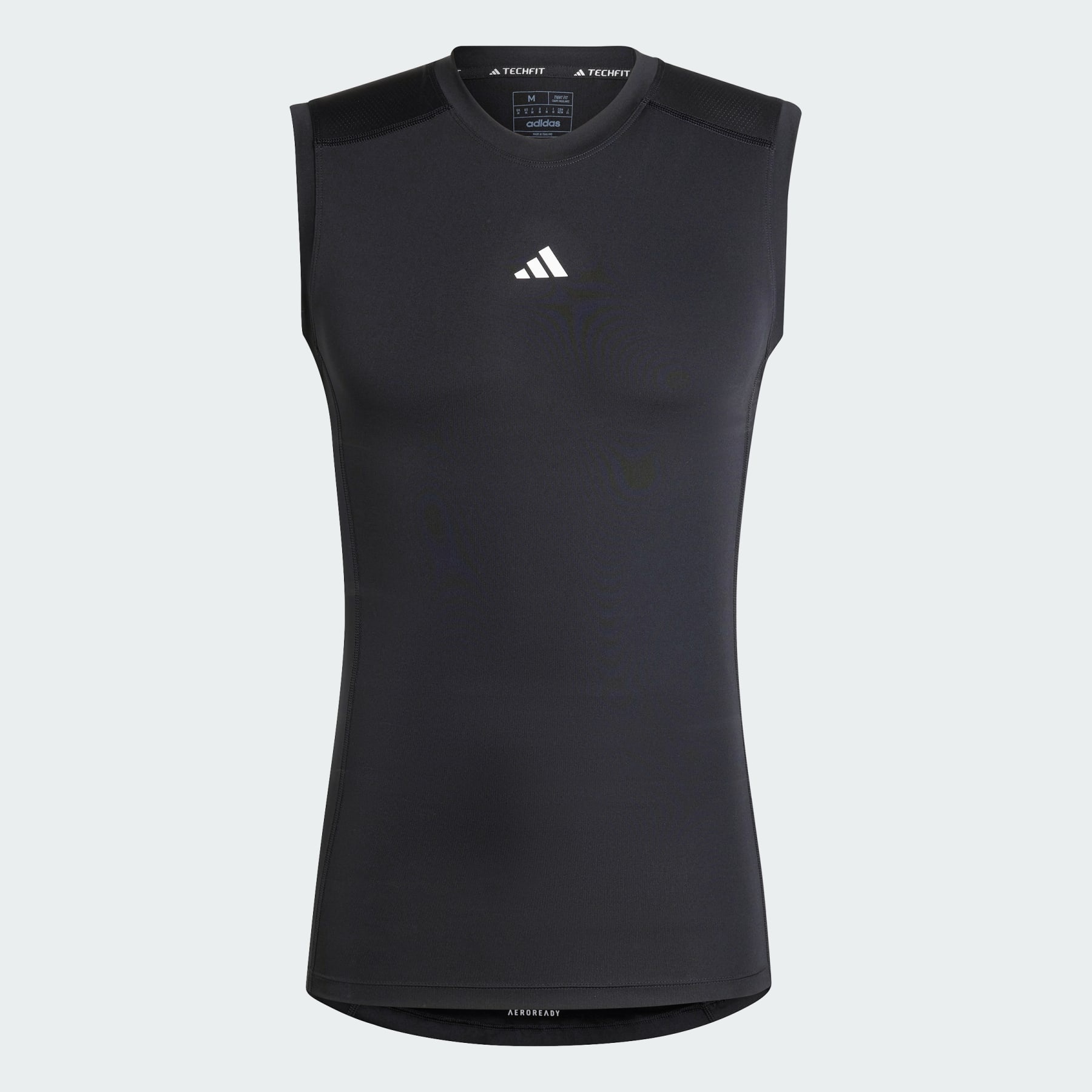 A sleeveless compression tee made in part with recycled materials. The new TECHFIT Compression fit is made of an AEROREADY single jersey and AEROREADY mesh for the back panel. This mesh ventilation allows for a breathable fit that leaves you with no distractions. With this product you will unlock your next level powerful moves with a compression fit that hugs your muscles. Details - Tight fit - Crewneck - 83% polyester (recycled), 17% elastane - Mesh back panel - AEROREADY - TECHFIT focuses your muscles' energy - Low-to-medium compression - Designed for freedom of movement - Ultraviolet Protect Factor (UPF) - Imported - Product code: JE6694 - Product color: Black