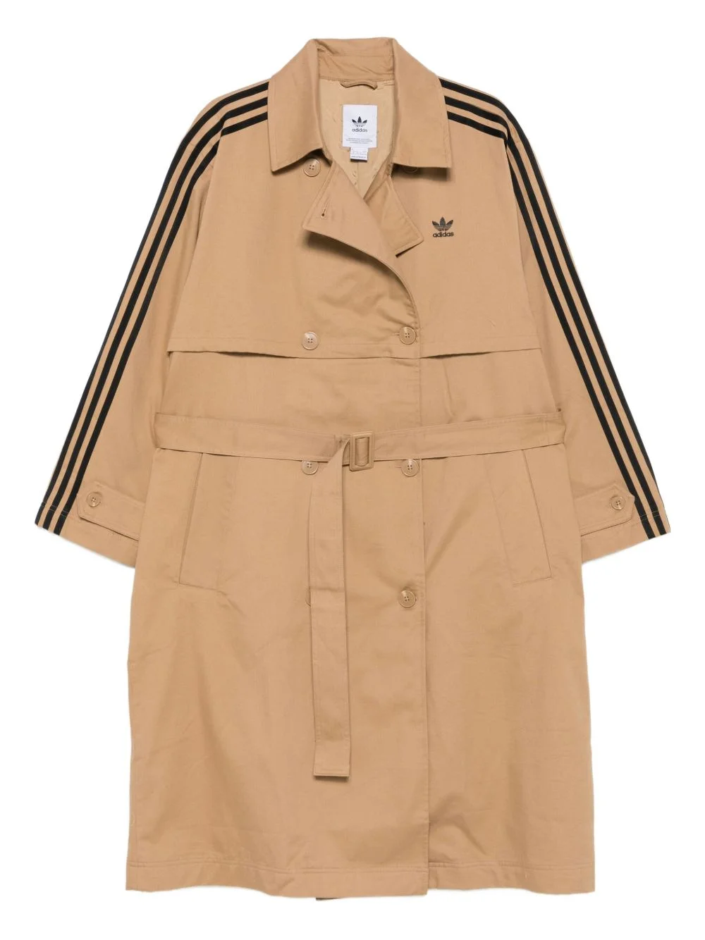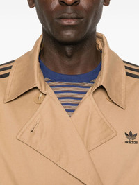 three-stripe belted trench coat Highlights - Beige - Cotton-blend - Signature three-stripe detail - Belted waist - Double-breasted - Button fastening - Long sleeves Imported Composition Outer: Cotton 77%, Recycled Polyester 23% Lining: Recycled Polyester 100% SIZE & FIT Model measurements Height 6 ft 2 in(1.87 m) Bust/Chest 36.41 in(92.5 cm) Hips 37 in(94 cm) Waist 29.52 in(75 cm) Washing instructions Machine Wash