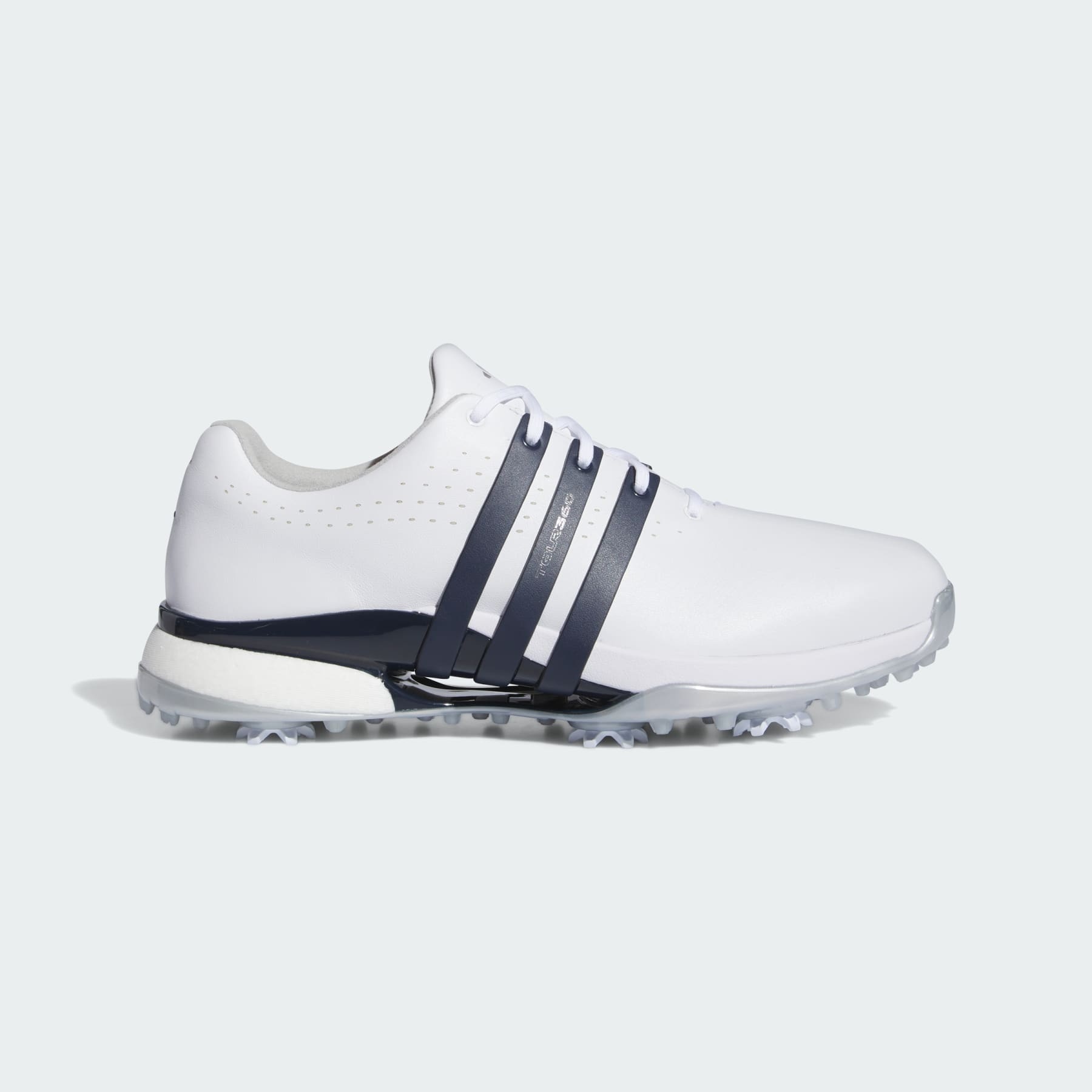 Premium tour level golf shoes for those dedicated to the game. Feel your best. Play your best. Confidence and style come naturally in the adidas Tour360 24 BOOST Golf Shoes. Made for tournament play and dedicated golfers, they wrap your feet in premium materials and feature leading-edge footwear technology for elite-level performance. The waterproof leather upper features 360Wrap for enhanced hold and support. A combination of adidas Lightstrike cushioning and BOOST complement a Torsion Bridge stabiliser to energize every step and stabilizes every stance for powerful drives. Elevate your game with golf shoes that let you look and feel your best. Details - Regular fit - Waterproof leather upper with 360Wrap support - INSITE® sockliner - Torsion Bridge - Lightstrike cushioning - Seven-spike TPU outsole - Imported - Product code: IF0245 - Product color: Cloud White / Collegiate Navy / Silver Metallic