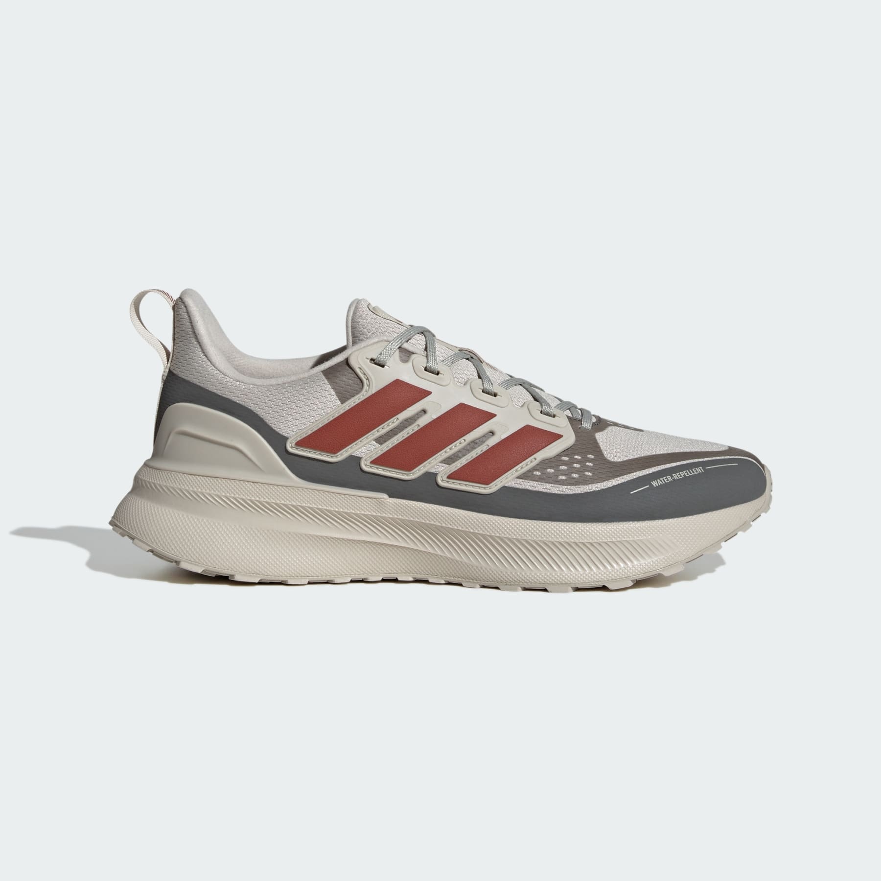 All-terrain running shoes made in part with recycled materials. Roam freely and explore beyond the beaten path in these adidas running shoes. With a lugged Adiwear outsole and a water-repellent upper that repels splashes and mud, they'll take you from sidewalk to park trails and back again. With every stride, Bounce cushioning provides enhanced comfort and flexibility. Reflective details light up in dim light. This product features at least 20% recycled materials. By reusing materials that have already been created, we help to reduce waste and our reliance on finite resources and reduce the footprint of the products we make. Details - Regular fit - Lace closure - Water-repellent mesh upper with reflective details - Textile lining - Mudguard - Bounce midsole - Weight: 12.2 ounces (size 9) - Midsole drop: 11 mm (heel: 35 mm / forefoot: 24 mm) - Adiwear outsole - Contains at least 20% recycled content - Imported - Product code: JH8779 - Product color: Beige / Preloved Ruby / Grey Four
