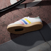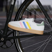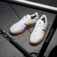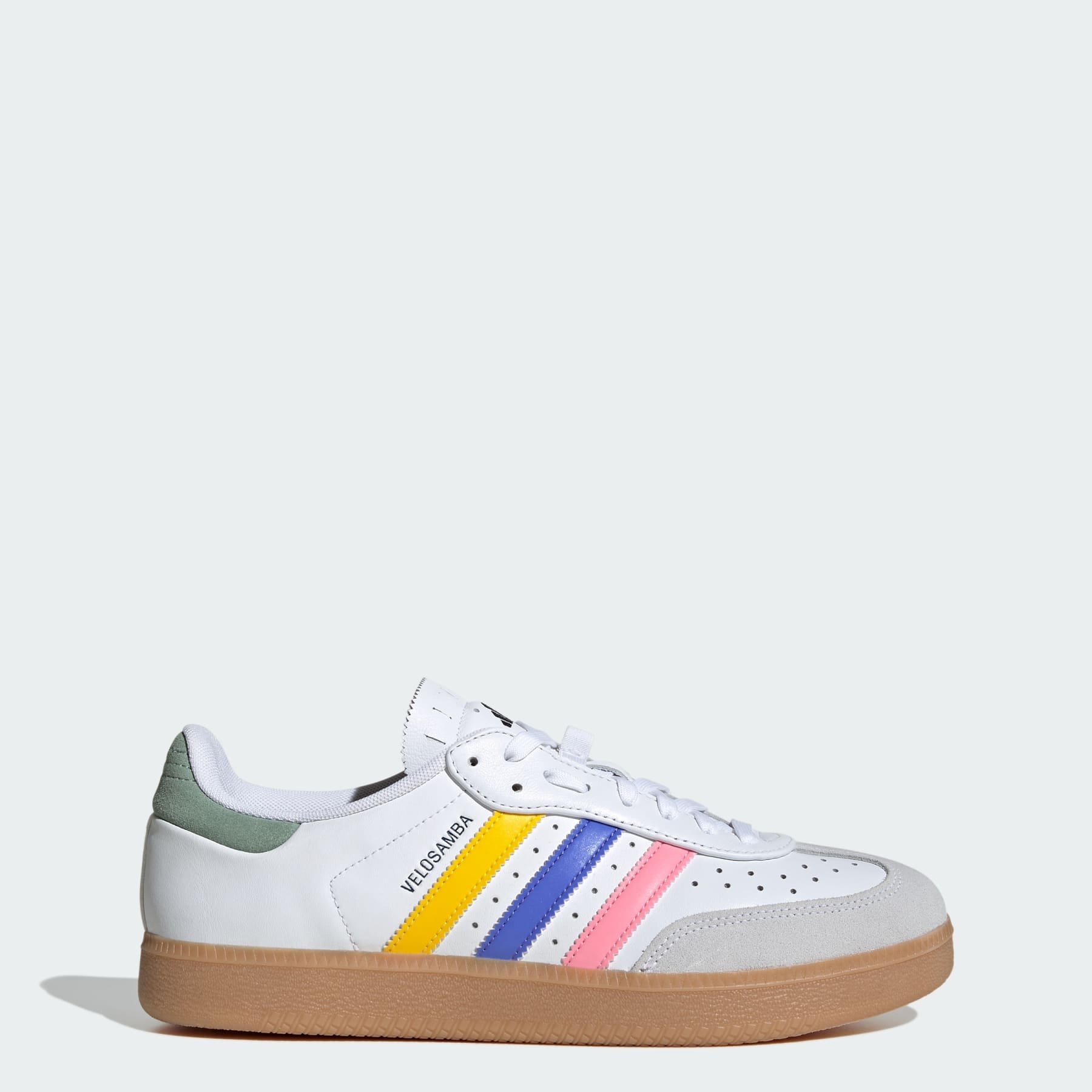 Samba style cycling shoes for the daily commute and beyond. Roll from the daily commute to work day and social hour with the iconic style of the adidas Samba on your feet. Designed with casual rides and commuting in mind, the Velosamba leather cycling shoes are your incognito bike shoe. They're two-bolt cleat compatible, with a two-thirds length midsole plate that stiffens the forefoot for efficient pedaling while maintaining a comfortable, natural flex for walking. Reflective 3-Stripes details add low-light visibility. A lace bungee secures loose lace ends. Details - Regular fit - Lace closure - Full grain leather upper - Nylon and glass composite midsole plate - Textile lining - Synthetic outsole with two-bolt cleat mount - Imported - Product code: IH5215 - Product color: Cloud White / Cobalt Blue / Bliss Pink