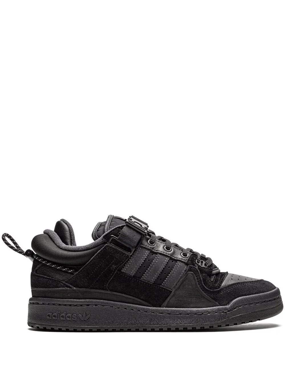 x Bad Bunny Forum Buckle Low "Back To School" sneakers The Bad Bunny x adidas Forum Buckle Low 'Back to School' is the third collaboration between adidas and the wildly popular Puerto Rican musician on the vintage basketball shoe. The sneaker's inspiration comes from Bad Bunny’s own personal life, in this instance, the footwear he wore with his school uniforms as a child. The entire shoe appears in a monochromatic black finish, including the premium suede and leather upper, adjustable ankle strap, and Three Stripes branding on both sides. Imported Composition Suede 100%