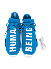 x Pharrell Williams Human Race NMD "Blue" sneakers Part of the initial release of the Pharrell x adidas NMD Human Race, this bright blue sneaker helped kick off a craze for the silhouette in 2016. The eye-catching edition has "Human" stitched across the top of the left shoe, and "Being" stitched across the top of the right. Imported Composition Calf Leather 100%