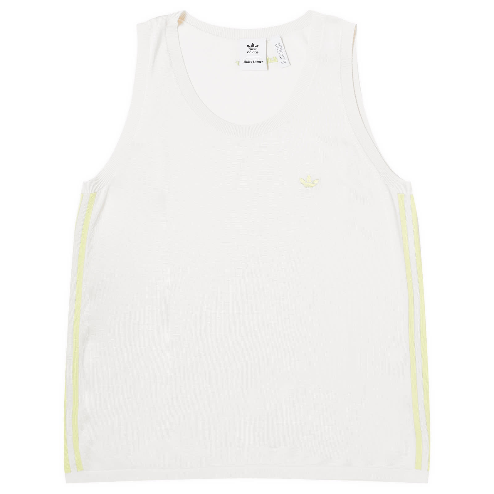Inspired by long distance runners, vivid colours and ease of movement, adidas x Wales Bonner's latest collection embodies the resilience, endurance and determination needed to reach your goals. The Knit Vest packs a visual punch, in a fresh white colour with pops of fluorescence highlighting brand motifs. Soft and breathable, this vest is crafted from a luxurious viscose blend for a high quality feel, undeniable comfort and contemporary style. - 67% Viscose, 33% Recycled Polyester - Round Neckline - Ribbed Trims - Machine Washable - Embroidered Wales Bonner Logo on Back - Embroidered Trefoil on Chest - 3 Stripe Detail on Sides