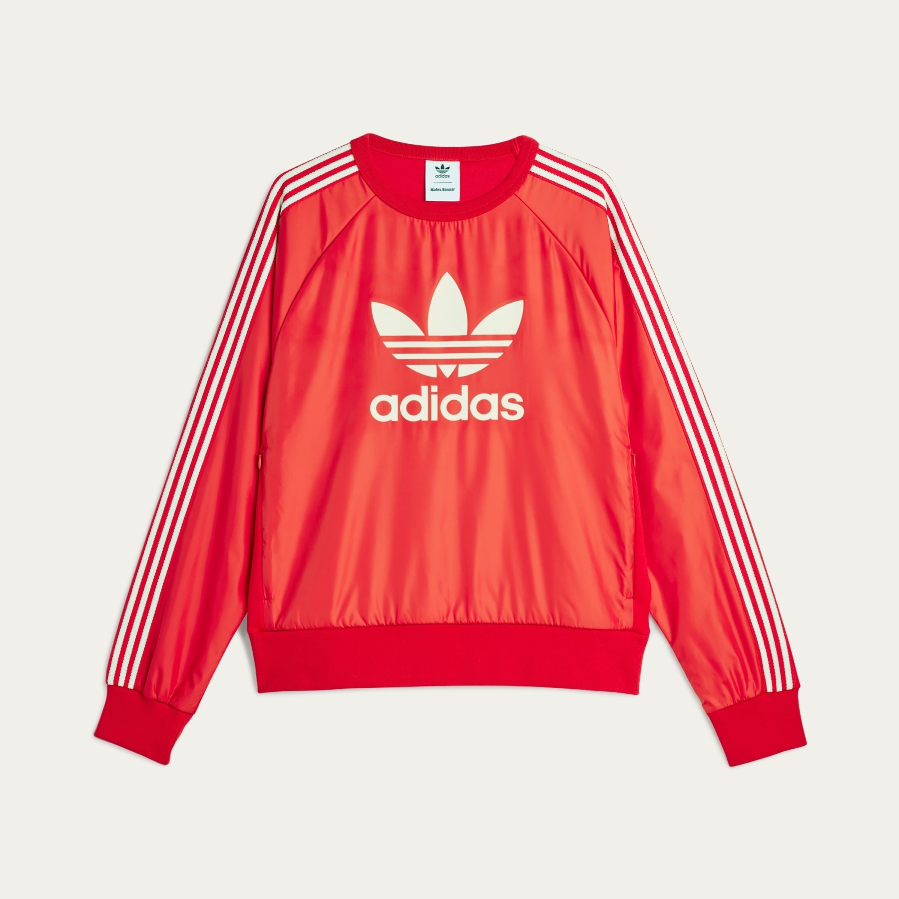 A jersey made in collaboration with Wales Bonner. The Fall/Winter 2024 collection from adidas and Wales Bonner merges tradition with modernity in a celebration of hip hop movement and romanticism. Music and creative vibrancy are threaded into the collection through the textures, shapes and colors across the pieces. The 3-Stripes of the Wales Bonner Nylon Crew Jersey are crafted with crochet tape, with crochet a staple detail in Wales Bonner collections over the years. The smooth, luxurious fabric is detailed with contrast pops of colors that emphasize the two brands different logos, coming together on the one silhouette. Details - Regular Fit - Ribbed crewneck - 61% polyester (recycled), 39% cotton - Ribbed cuffs and hem - Imported - Product code: JE5994 - Product color: Better Scarlet