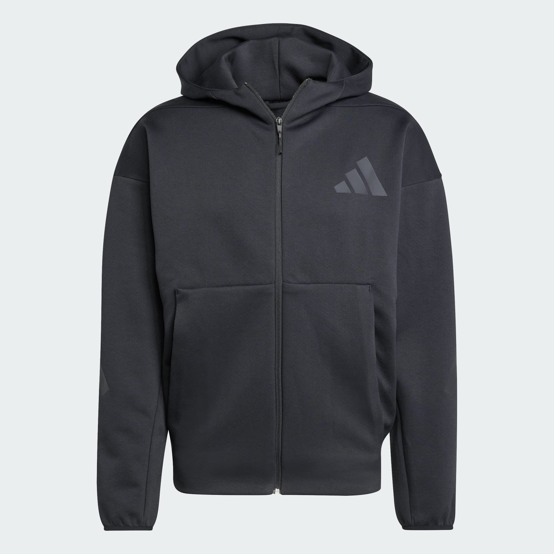 A cozy adidas Z.N.E. track jacket made in part with a blend of recycled and renewable materials. Zip up and find your focus in this adidas track jacket. The cozy three-layer doubleknit fabric helps lock in warmth, while a full-coverage hood makes it easy to block out the world when you need some "me time." When you're feeling refreshed and ready to take on the day, a matte rubber-print 3 Bar Logo reminds you that you're always connected to your community through sport. By choosing recycled, we are able to reuse materials that have already been created, which helps to reduce waste. Renewable materials choices will help us to remove our reliance on finite resources. Our products made with a blend of recycled and renewable materials feature at least 70% total of these materials. Details - Regular fit - Full zip with hood - 57% polyester (recycled), 43% cotton - Front zip pockets - Three-layer fabric - Contains a minimum of 70% recycled and renewable content - Imported - Product code: JE7538 - Product color: Black