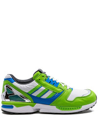 ZX8000 "Kawasaki Ninja" sneakers Adidas teams up with Japanese motorcycle brand Kawasaki to produce these ZX8000 "Kawasaki Ninja" sneakers. Taking inspiration from the famous Moto ZX 10R "Ninja" motorcycle, the pair arrives with a white base hue and plays host to bright green and blue detailing alongside silver-tone metallic embellishments and ‘Ninja’ prints on the side walls. Dual branding appears printed on the tongues to further establish the blended aesthetics of the two legendary brands. Highlights - White/green/blue - Panelled design - Signature 3-stripes logo - Metallic effect - Round toe - Front lace-up fastening - Logo patch at the tongue - Rubber sole - These styles are supplied by a premium sneaker marketplace. stocking only the most sought-after footwear, they source and curate some of the most hard to find sneakers from around the world. Imported Composition Leather 100%