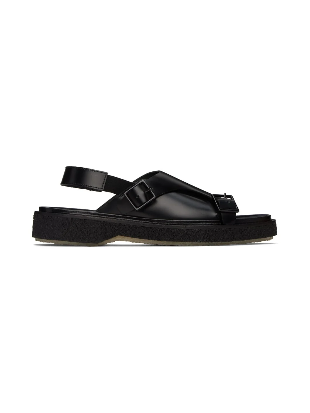 Polished leather sandals in black. · Open round toe · Pin-buckle straps at vamp · Elasticized slingback ankle strap · Logo-printed leather footbed · Crepe rubber sole Supplier color: Black