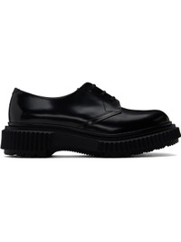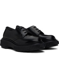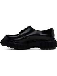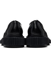 Polished leather derbys in black. · Lace-up closure · Logo printed at padded leather footbed · Suede and buffed leather lining · Serrated detailing at welt · Textured rubber midsole · Treaded rubber sole Supplier color: Black Upper: leather. Sole: rubber. Made in Portugal 251546M225005