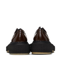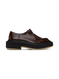 Polished leather derbys in brown. · Moc toe · Lace-up closure · Logo printed at padded leather footbed · Suede and buffed leather lining · Scalloped detailing at welt · Crepe rubber sole · Heel: H1.75" Supplier color: Dark brown expresso Upper: leather. Sole: rubber. Made in Portugal 241546M225004