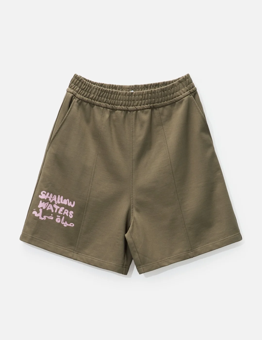 - ADISH - Cotton Shallow Waters Shorts - Made with cotton French Terry - Screen-printed graphics - Palestinian hand embroidery - Elastic waistband - Two side pockets - Color: Khaki - Material: 100% Cotton - See more Shorts and Clothing SIZING - Model wears size M - Model measures: Height 187cm, Chest 36”/91cm, Waist 28”/72cm, Hip 36”/91