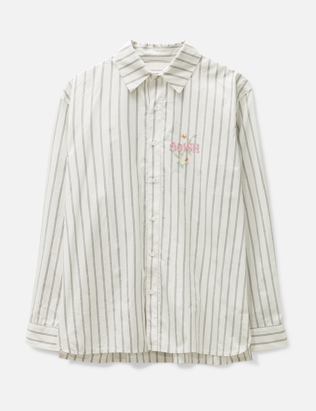 - ADISH - Nafnuf Logo Cotton Striped Shirt - Long Sleeve - Front button closure - Palestinian hand-embroidery detail on the chest - Buttoned cuffs - Straight hem - Color: Off White - Material: 100% Cotton - See more Shirts and Clothing SIZING - Model wears size L - Model measures: Height 188cm, Chest 36”/90cm, Waist 32”/83cm, Hip 37”/93cm