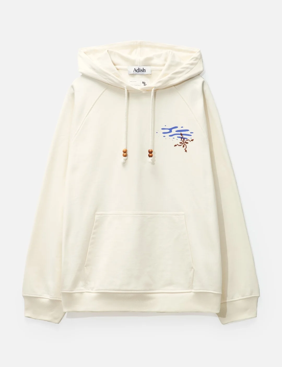 - ADISH - Shallow Waters Kharaz Hoodie - Drawstring hood - Soft French Terry - Screen-printed graphics and Palestinian hand-made embroidery on chest and back - Kangaroo pocket - Ribbed cuffs and hem - Color: Off-white - Material: 100% Cotton - See more Hoodies and Clothing SIZING - Model wears size M - Model measures: Height 187cm, Chest 36”/91cm, Waist 28”/72cm, Hip 36”/91