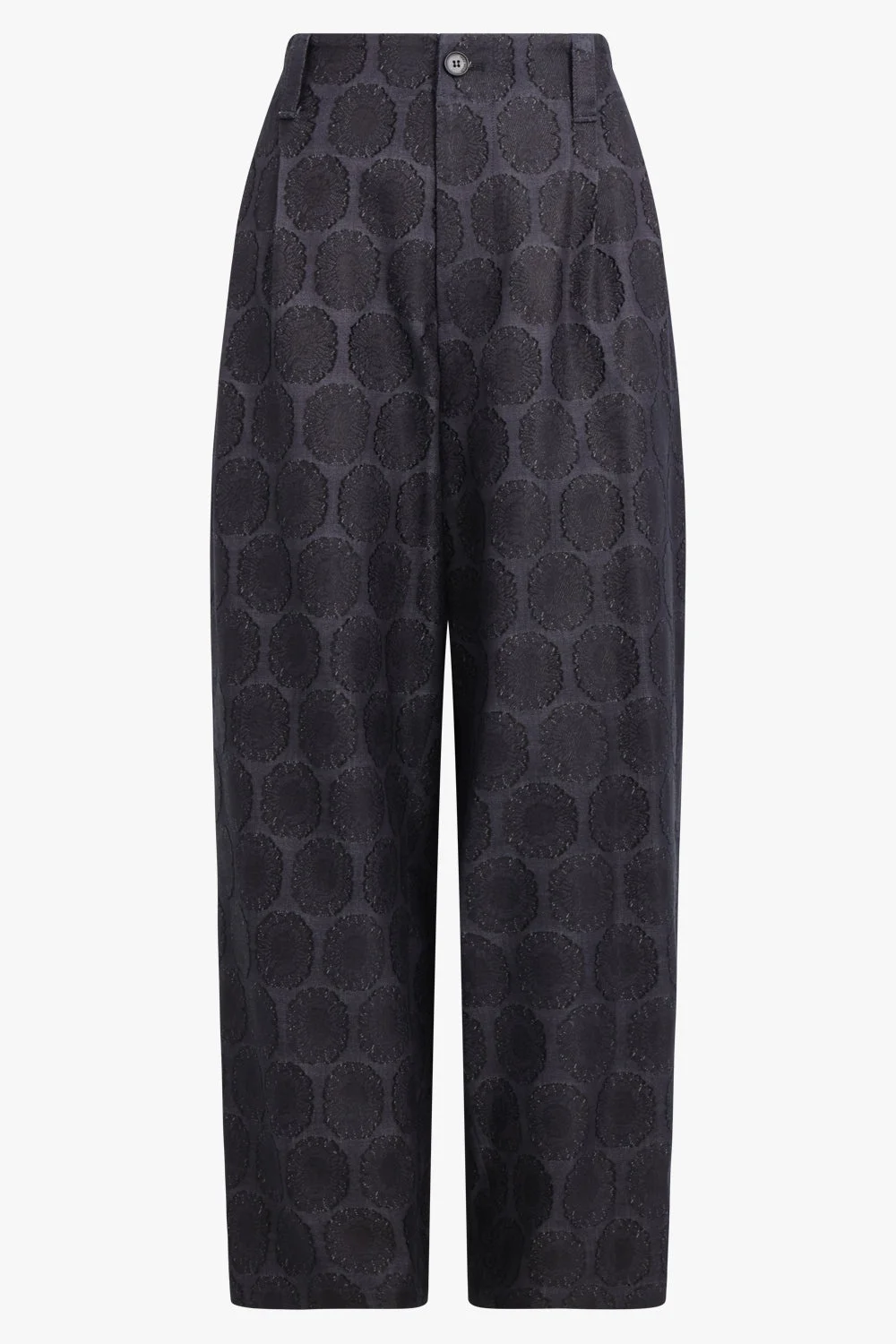 After prays slacks features pin-tucked sides and a button-up closure, along with a flower jacquard design. The hemmed bottoms and pockets add functionality to the sleek and stylish slacks. Fabrication: Cotton 85%, Polyester 15% Made in South Korea Size and Fit Model is 191cm/6’02” and is wearing a size M Model Measurements: Bust: 94cm, Waist: 76cm, Hips 89cm Fit is true to size. Measurements Size S: Waist 74cm, Hips 94cm, Length 105cm Size M: Waist 80cm, Hips 98cm, Length 105cm Size L: Waist 84cm, Hips 102cm, Length 105cm