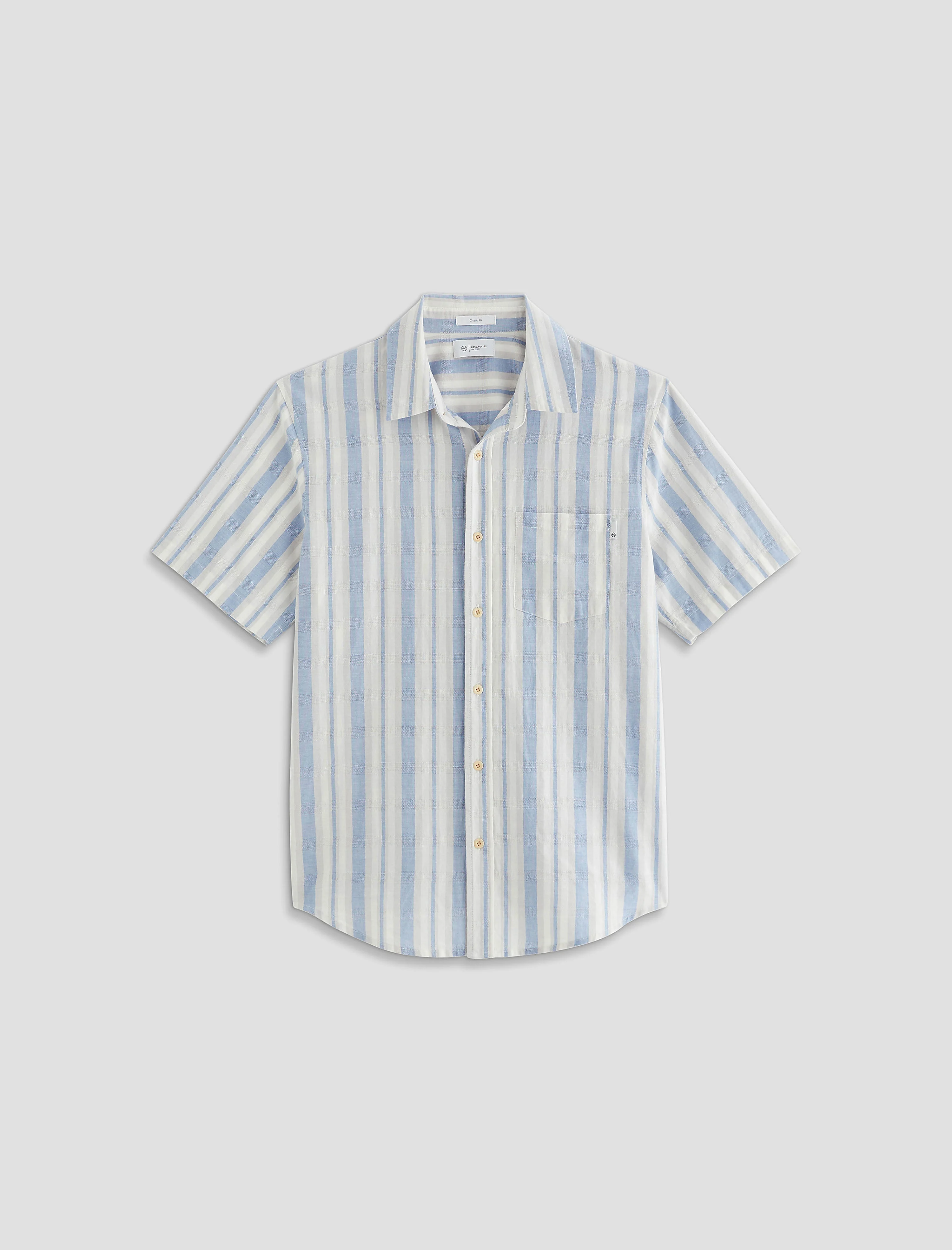 Classic Button Up The Aiden Short Sleeve Shirt is a classic short-sleeve button-up made from 100% cotton. It features a button placket, single chest pocket, and back pleat detailing for a clean, timeless look. DETAILS & FIT Model is wearing size M. - Body Length: 29 1/2" - Sleeve Length: 9" - Chest Width: 44" FABRIC & CARE Variegated Cotton Stripe, 100% Cotton