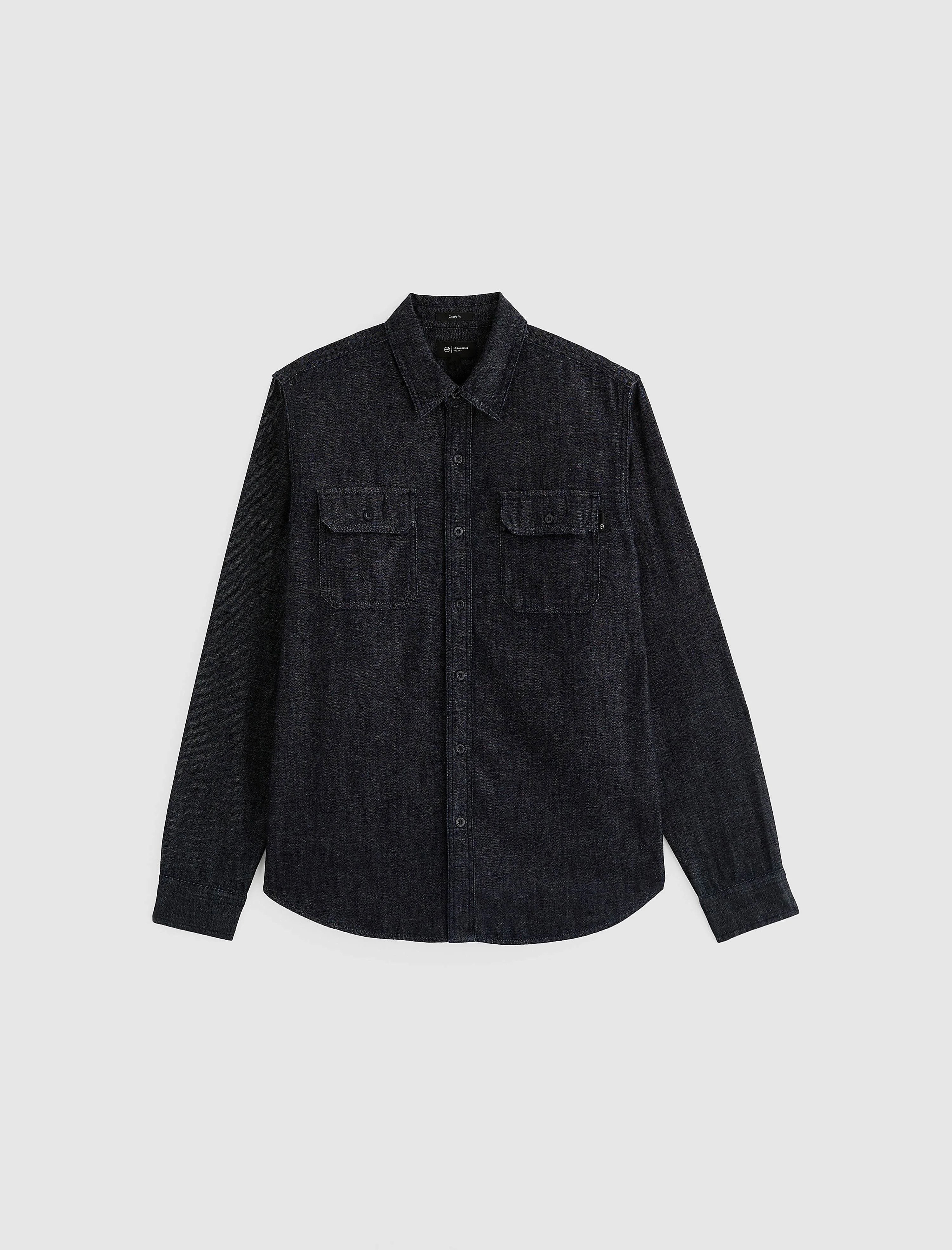 Classic Button Up Aiden is a utility shirt crafted from Nimble Indigo Comfort Stretch Denim in our barely-black wash, Figueroa. Classic fit, curved hem, long sleeves. Detailed with branded corozo buttons and logo on the chest flap pocket. Inspired by utility and designed with a more refined touch, this denim button-up is easy to style. DETAILS & FIT Model is wearing size M. - Body Length: 29 1/2" - Sleeve Length: 25 1/2" - Chest Width: 44 1/2" FABRIC & CARE Nimble Indigo Denim, 7.25 Oz. 80% Cotton 12% Lyocell, 5% polyester, 3% Elastane