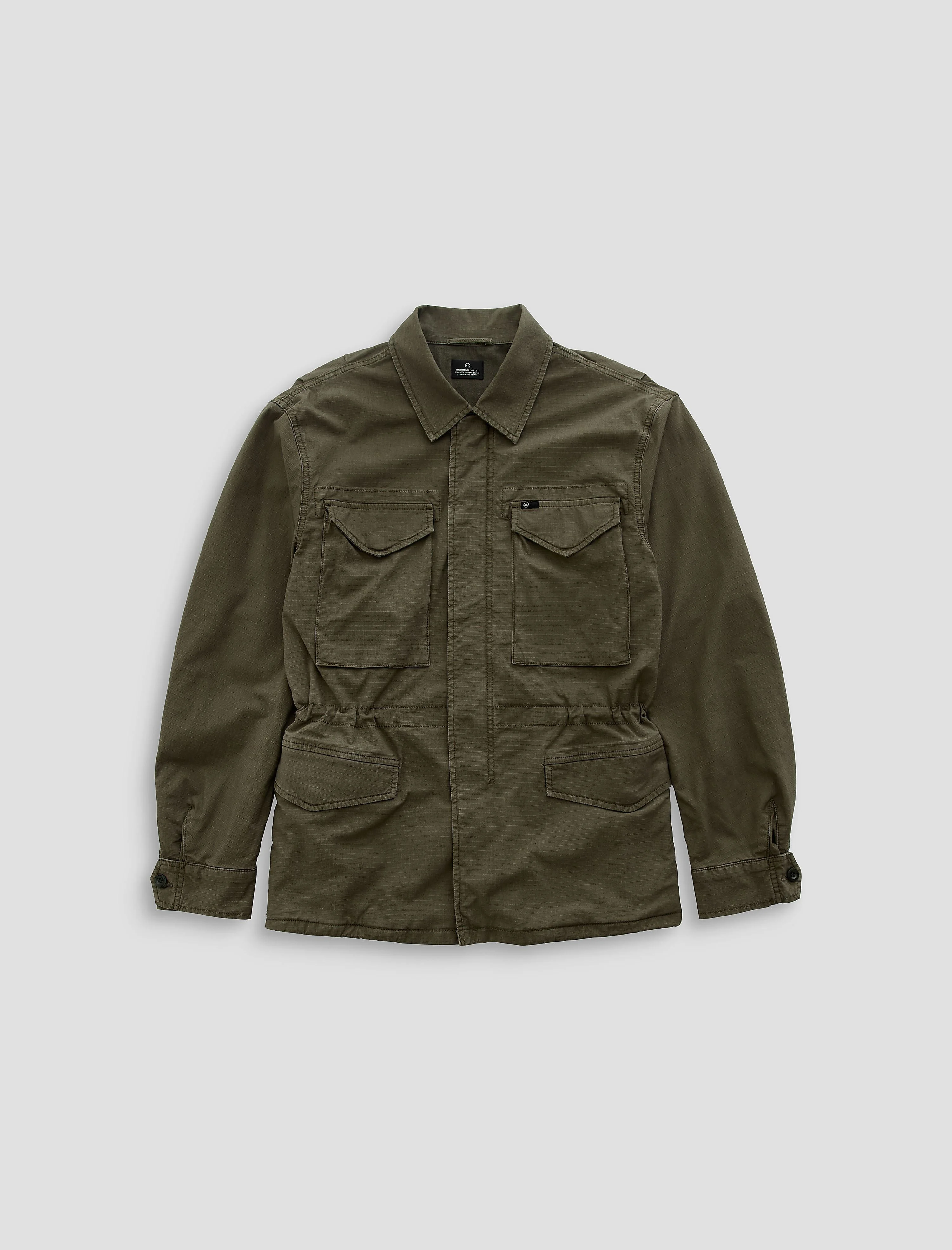 Ultility Jacket The Anderson Jacket is a utility jacket woven from our cotton blend Comfort Stretch Rip Stop fabric for lasting quality to resist tears and withstand the rigors of the road. This functional style features front flap pockets, zip-up and snap button-front closures, ruched waist, and self-ties at the hem. The ultimate outer layer for those who value a rugged aesthetic without sacrificing a polished silhouette. Meticulously sulfur-dyed to a lived-in olive green wash, Coastal Moss. DETAILS & FIT Model is wearing size M. - Body Length: 31" - Sleeve Length: 24 1/2" - Chest Width: 46" FABRIC & CARE Stretch Rip Stop, 6.7 Oz. 97% Cotton, 3% Spandex/Elastane