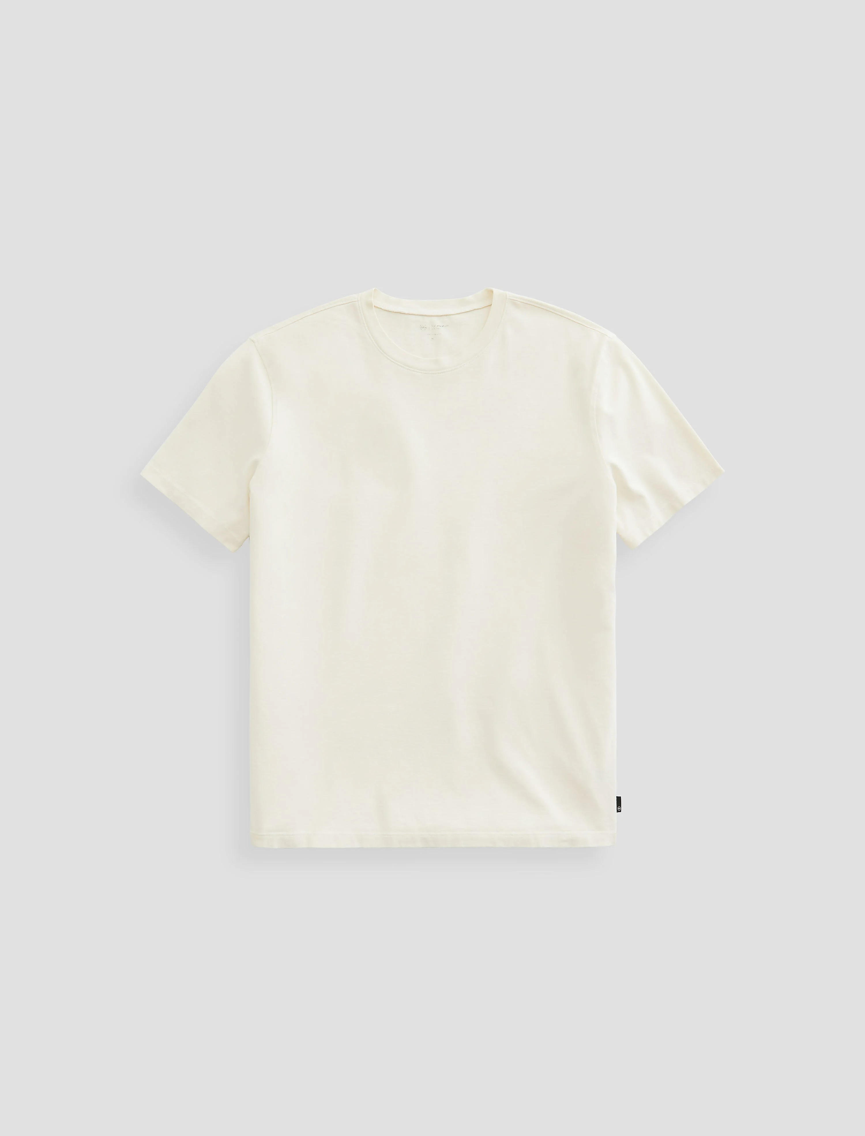 Classic Tee The Bryce Crew in ivory dust is a classic fit crewneck, short sleeve tee. The tee offers a 1X1 baby rib at the neck to create a great crew shape and serves as the perfect base when layering all year long. Our Jersey Knit offers a luxurious comfort that is unrivaled—knitted with both S-twist and Z-twist yarn to sustain longevity and stability, preventing unnecessary twisting and torquing. During the production process, the S-twist yarn is spun counter-clockwise creating a right-handed twill. The Z-twist yarn works in opposition, spinning clockwise for a left-handed twill. This opposition—when working together—yields a softer, more durable fabrication and gives strength to the yarn making it more difficult to pull apart. Designed in 100% Cotton. DETAILS & FIT Model is wearing size M. - Body Length: 28" - Sleeve Length: 8 1/2" - Chest Width: 42" FABRIC & CARE Light Cotton Jersey, 100% Cotton