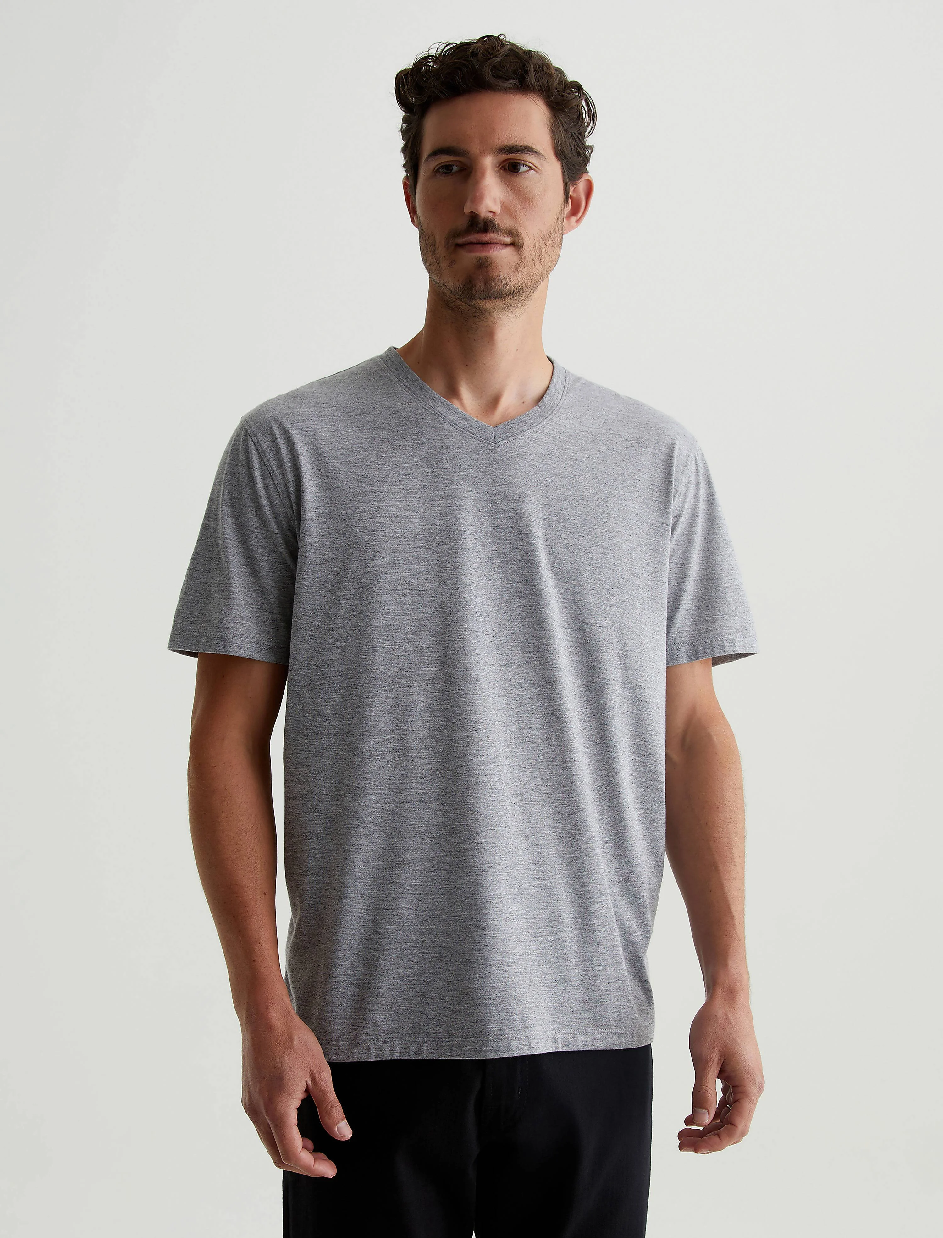 Classic V-Neck Tee The Bryce Vee for men features a heather grey hue and a classic V-neck line. This men’s t-shirt is designed in a lightweight Heather Comfort Jersey. DETAILS & FIT Model is wearing size M. - Body Length: 28" - Sleeve Length: 8 1/2" - Chest Width: 42" FABRIC & CARE Heather Comfort Jersey 48% Cotton, 37% Rayon, 12% Polyurethane, 3% Polyster