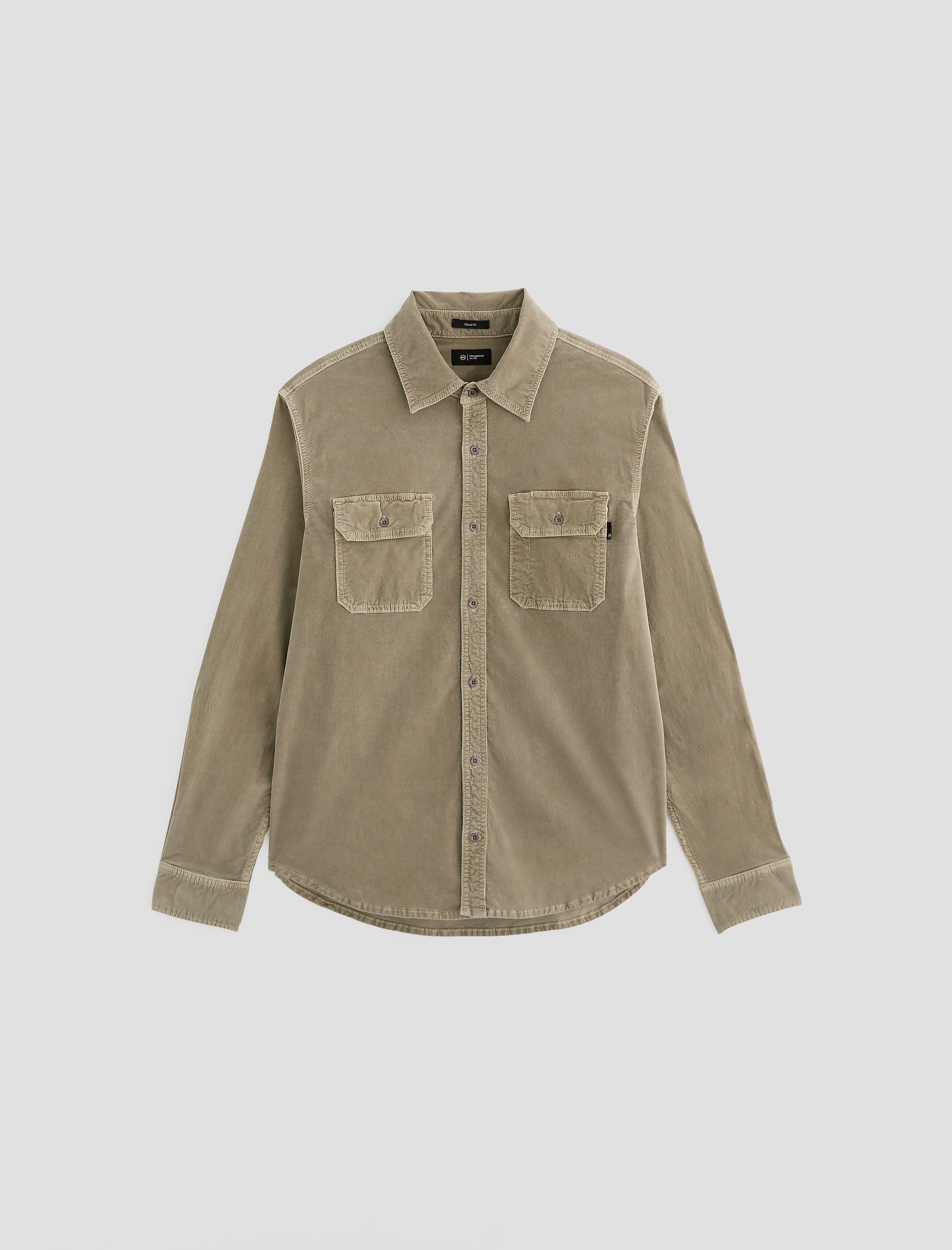 Classic Button Up The Curtis Corduroy Work Shirt is a long-sleeve button-up with a classic fit done in a tan hue. Crafted from hand-soft corduroy, it offers a structured feel, bringing timeless workwear appeal to a versatile everyday layer. This Italian corduroy delivers warmth, softness, and rich texture in a comfortable fine wale construction. DETAILS & FIT Model is wearing size M. - Body Length: 29 1/2" - Sleeve Length: 26" - Chest Width: 43" FABRIC & CARE Velvet Corduroy, 6.4 Oz. 98% Cotton, 2% Polyurethane