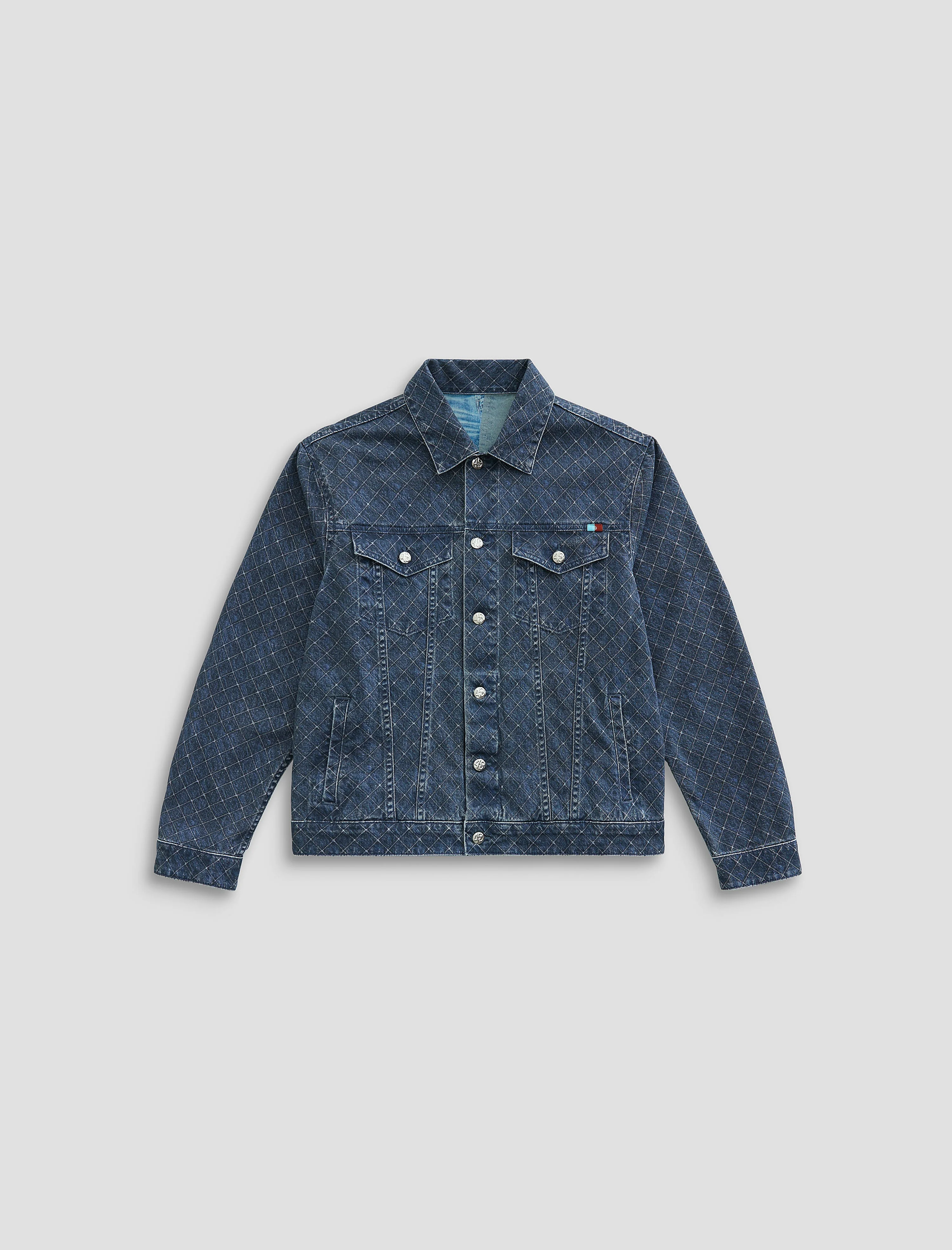 Classic Trucker The Dart Jacket offers an updated take on our classic men's trucker made from 10 oz. Dover Stretch Denim—complete with a printed, quilted diamond design on the outside and denim jeans on the inside. Flap pockets, adjustable waist tabs, and concealed hip pockets are functional details with timeless appeal. DETAILS & FIT Model is wearing size M. - Body Length: 26" - Chest Width: 45" - Sleeve Length: 25 1/2" FABRIC & CARE AG Cloud Soft Denim™, Hyper Soft Bull Denim, 8.7 Oz. 93% Cotton, 6% Polyester, 1% Elastane