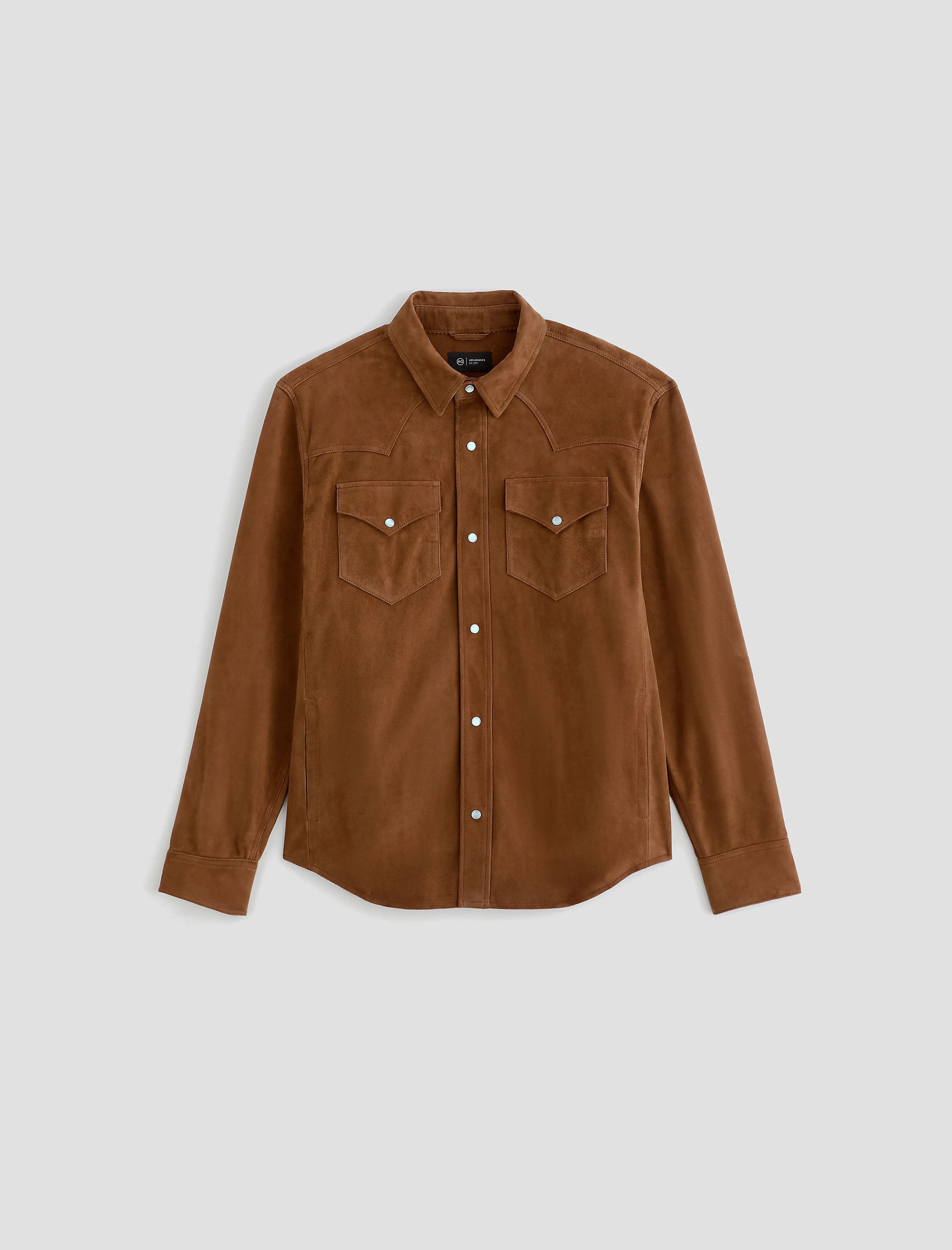 Relaxed Overshirt The Elias Suede Shirt Jacket is a relaxed western-inspired style crafted from soft mid-weight goat suede. This long-sleeve button-up features classic pointed western yoke detailing and a laid-back silhouette for a timeless appeal and rugged look. Pearl snap closure down the front placket and chest for added western charm. DETAILS & FIT Model is wearing size M. - Body Length: 29" - Chest Width: 46" - Sleeve Length: 25" FABRIC & CARE Luxe Suede, 100% Goat Suede