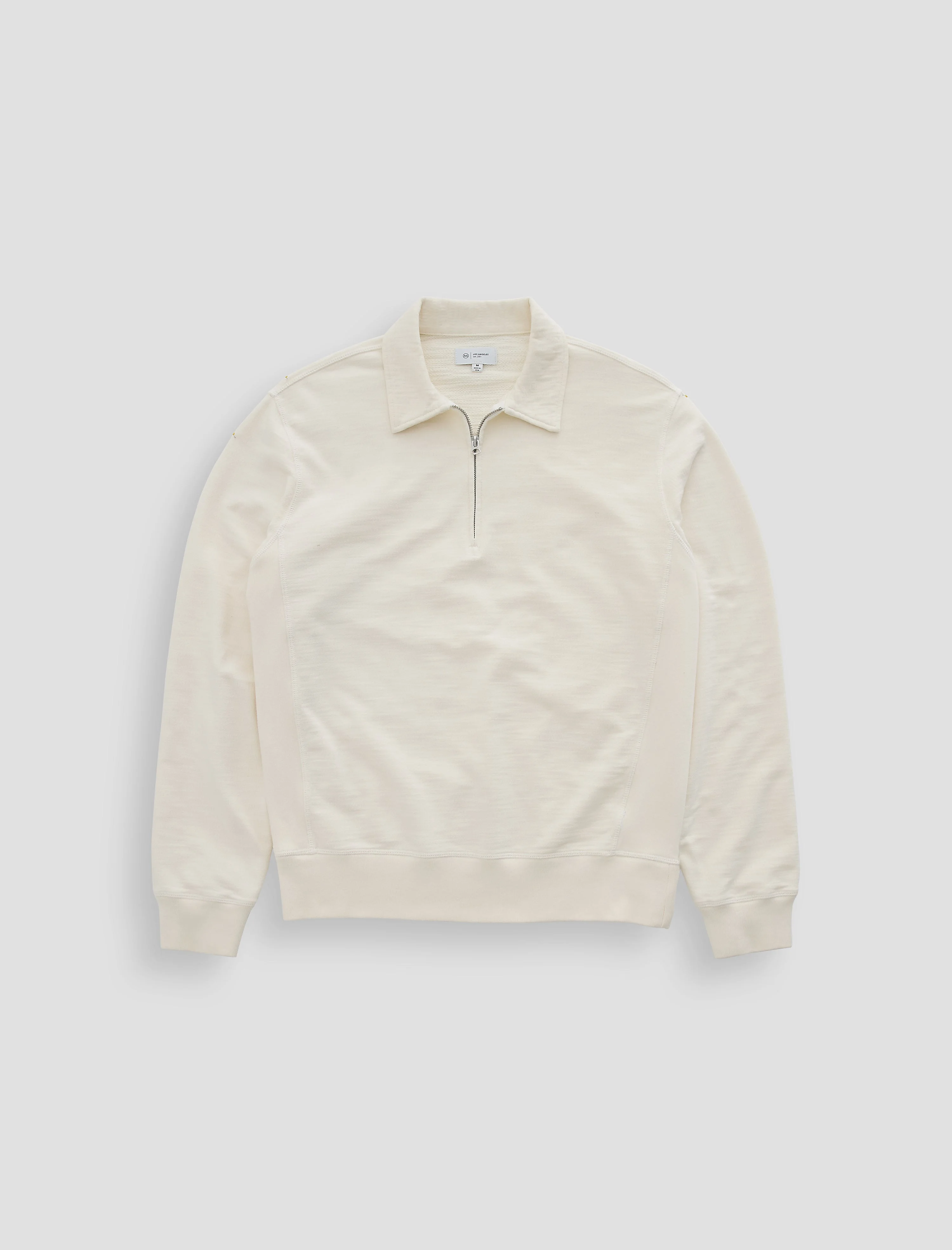 Quarter Zip Pullover Ethan is a 100% premium cotton terry sweatshirt with a classic fit designed in a luxurious off-white color, Ivory Dust. Pointed collar, partial zipper front closure, ribbed trim, and clean side seams. DETAILS & FIT Model is wearing size M. - Body Length: 27" - Sleeve Length: 25 1/2" - Chest Width: 44" FABRIC & CARE Cotton Slub Loop Back Terry, 9.9 Oz. 100% Cotton