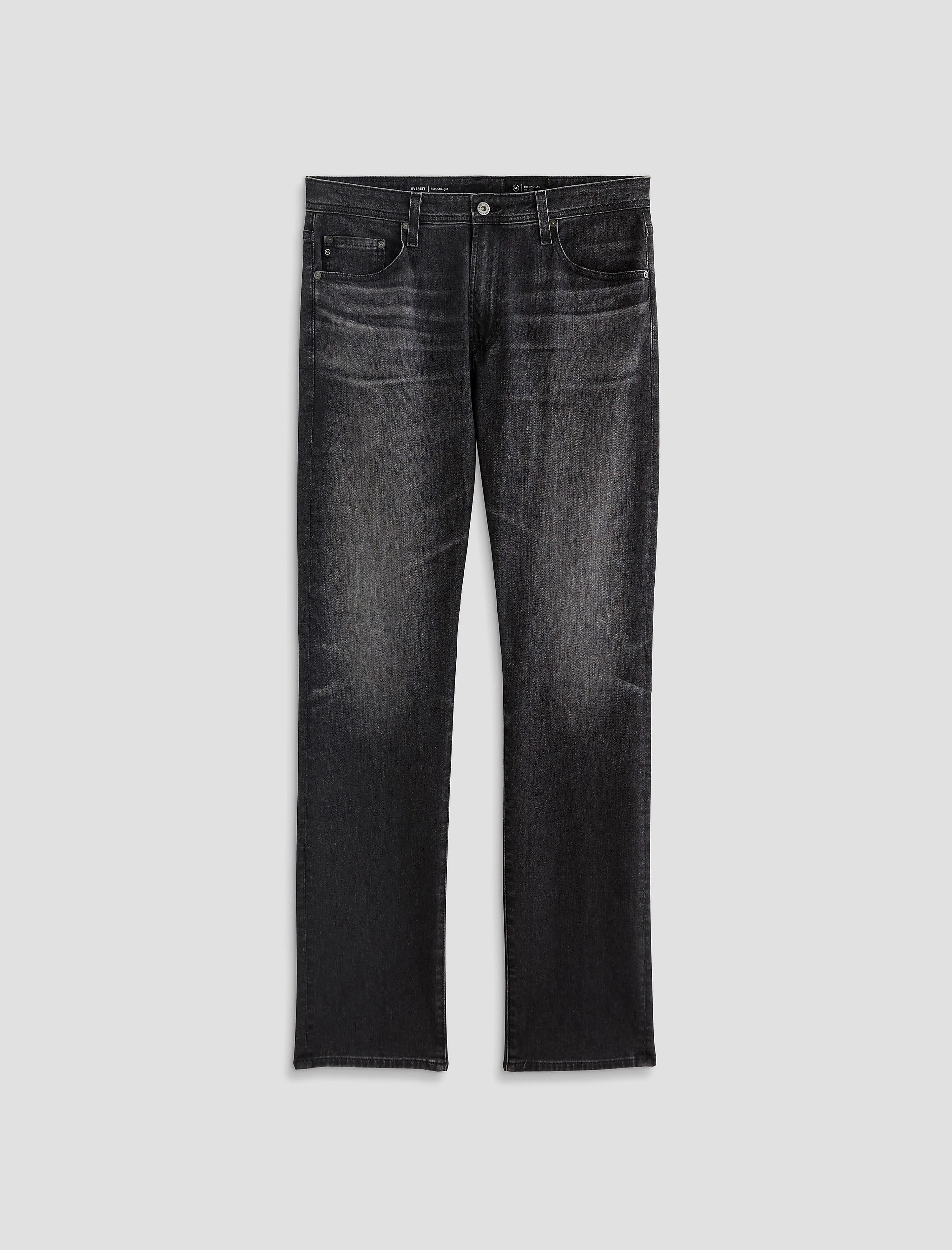 Slim Straight The Everett is a slim straight men’s jean designed in AG Cloud Soft Denim™ for a soft, comfortable feel. It features a classic five-pocket design, a mid-rise waist, and a straight fit that’s relaxed from hip to knee with a slight taper at the leg opening. Finished in a classic black wash. DETAILS & FIT Model is wearing size 32. - Front Rise: 10 1/4" - Knee Opening: 16 1/2" - Bottom Opening: 15" - Inseam: 34" FABRIC & CARE AG Cloud Soft Denim™, Hypersoft Black Denim, 9.1 Oz. 93% Cotton, 6% Polyester, 1% Elastane