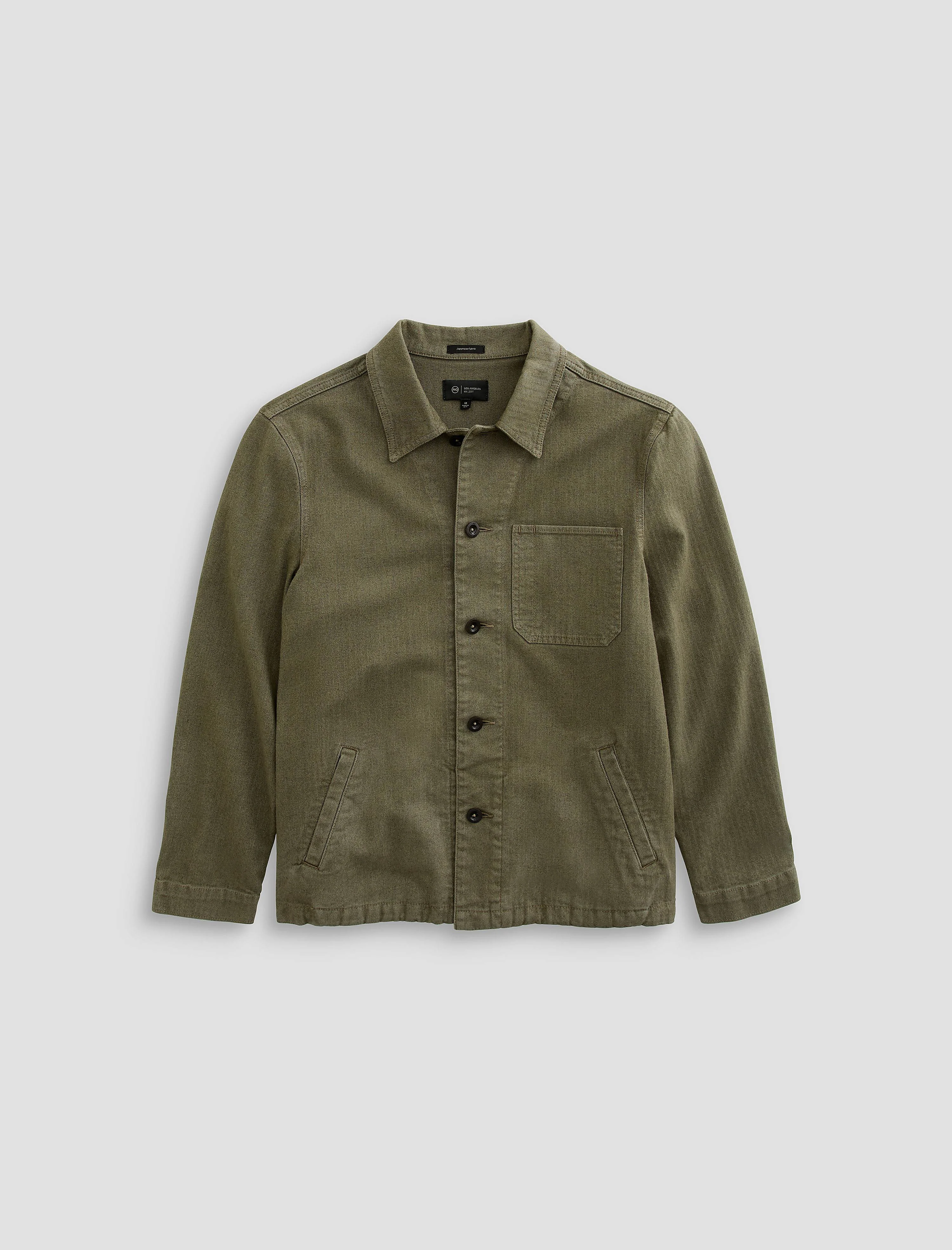 Utility Shirt Jacket George is a utility shirt jacket crafted in Herringbone twill for durability and a textured, sophisticated appearance. Boxy, slightly cropped fit, roomy sleeves. Complete with an adjustable waist and roll tabs. Designed in our earthy green wash, Dusty Sage. DETAILS & FIT Models are wearing size M. - Body Length: 27" - Chest Width: 46" - Sleeve Length: 25 1/2" FABRIC & CARE Herringbone Twill, 9.75 Oz 96% Cotton 4% Spandex/Elastane