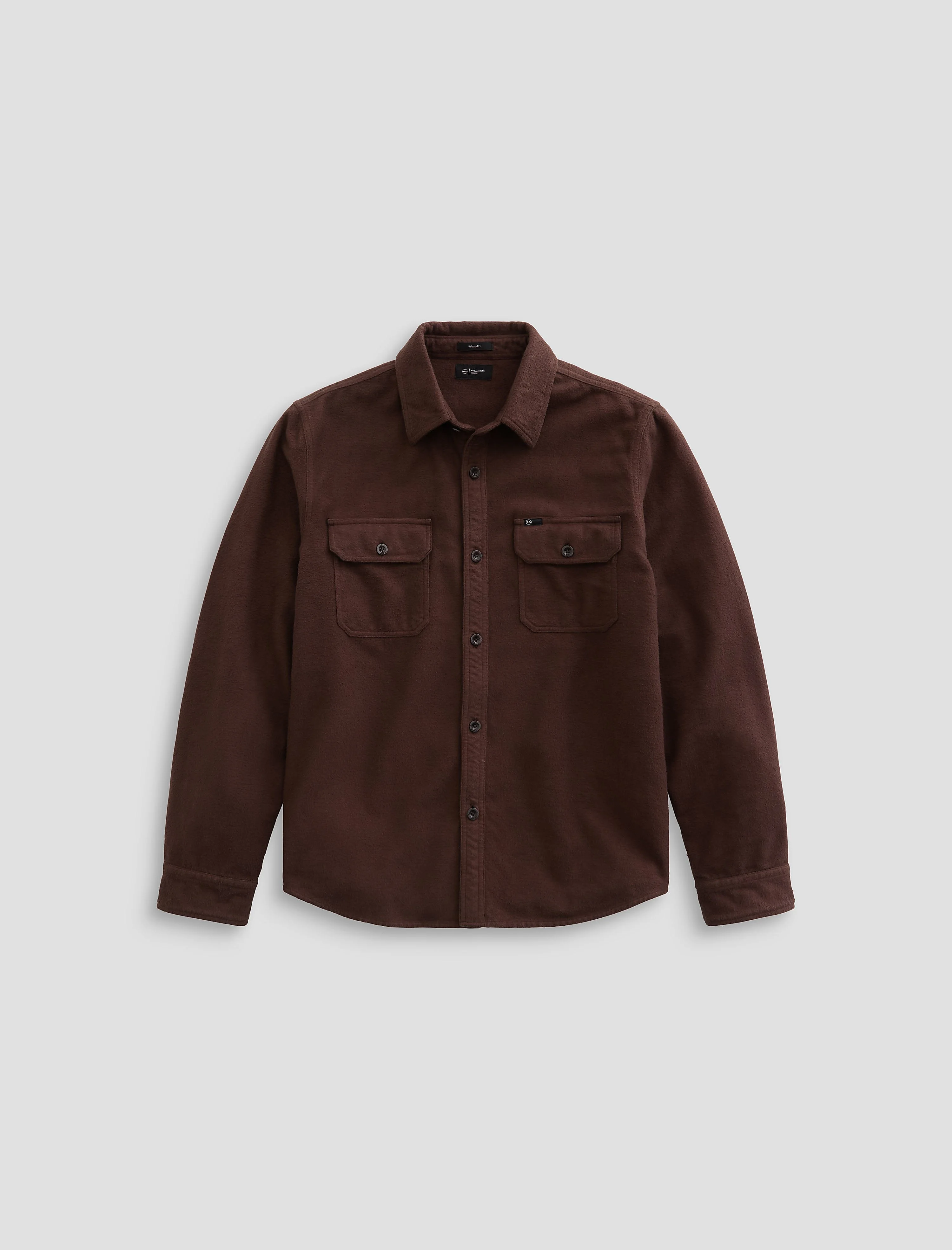 Relaxed Button Up Milland is a utility shirt crafted from brushed cotton canvas in dark chocolate brown. Relaxed fit, rounded hem, easy-to-style. Detailed with branded corozo buttons and logo on the chest flap pocket. DETAILS & FIT Model is wearing size M. - Body Length: 29 1/2" - Sleeve Length: 26" - Chest Width: 45 1/2" FABRIC & CARE Brushed Cotton Canvas, 8.26 Oz 98% Cotton 2% Elastane