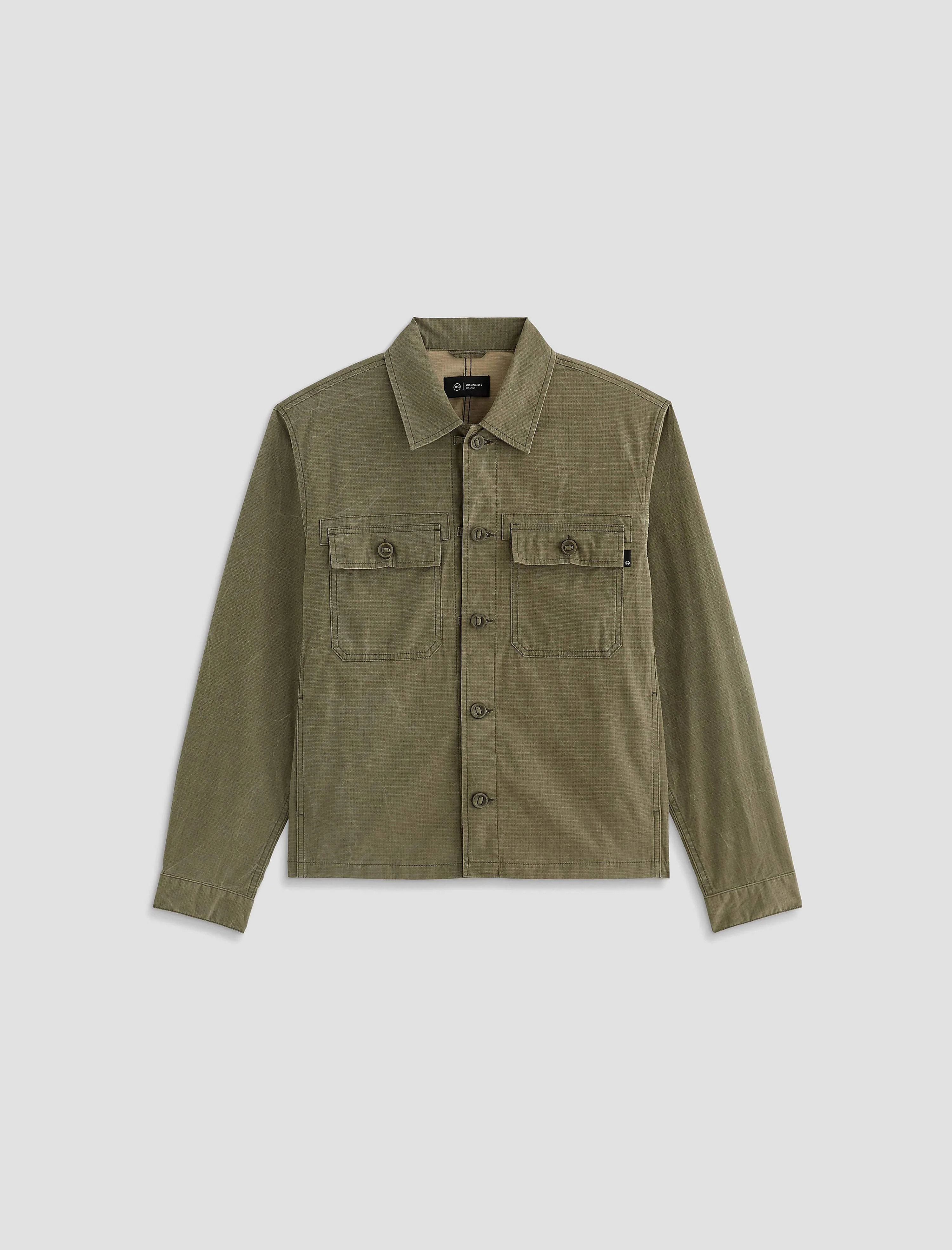 Modern Chore Coat The Philip Utility Jacket is a modern take on the classic chore style, crafted from Coated Micro Ripstop in a green wash. This long-sleeve jacket features two front button-flap pockets and stitched hems for a utility-inspired finish. DETAILS & FIT Model is wearing size M. - Body Length: 25 1/2" - Chest Width: 46" - Sleeve Length: 26" FABRIC & CARE Coated Micro Ripstop, 97% Cotton, 3% Elastane